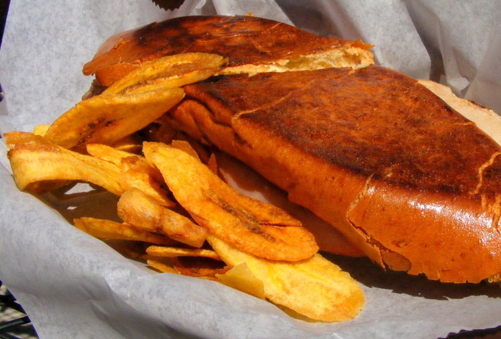 I had the Media Noche — ham, roast pork, Swiss cheese, pickles and mustard on sweet bread with plantain chips.
