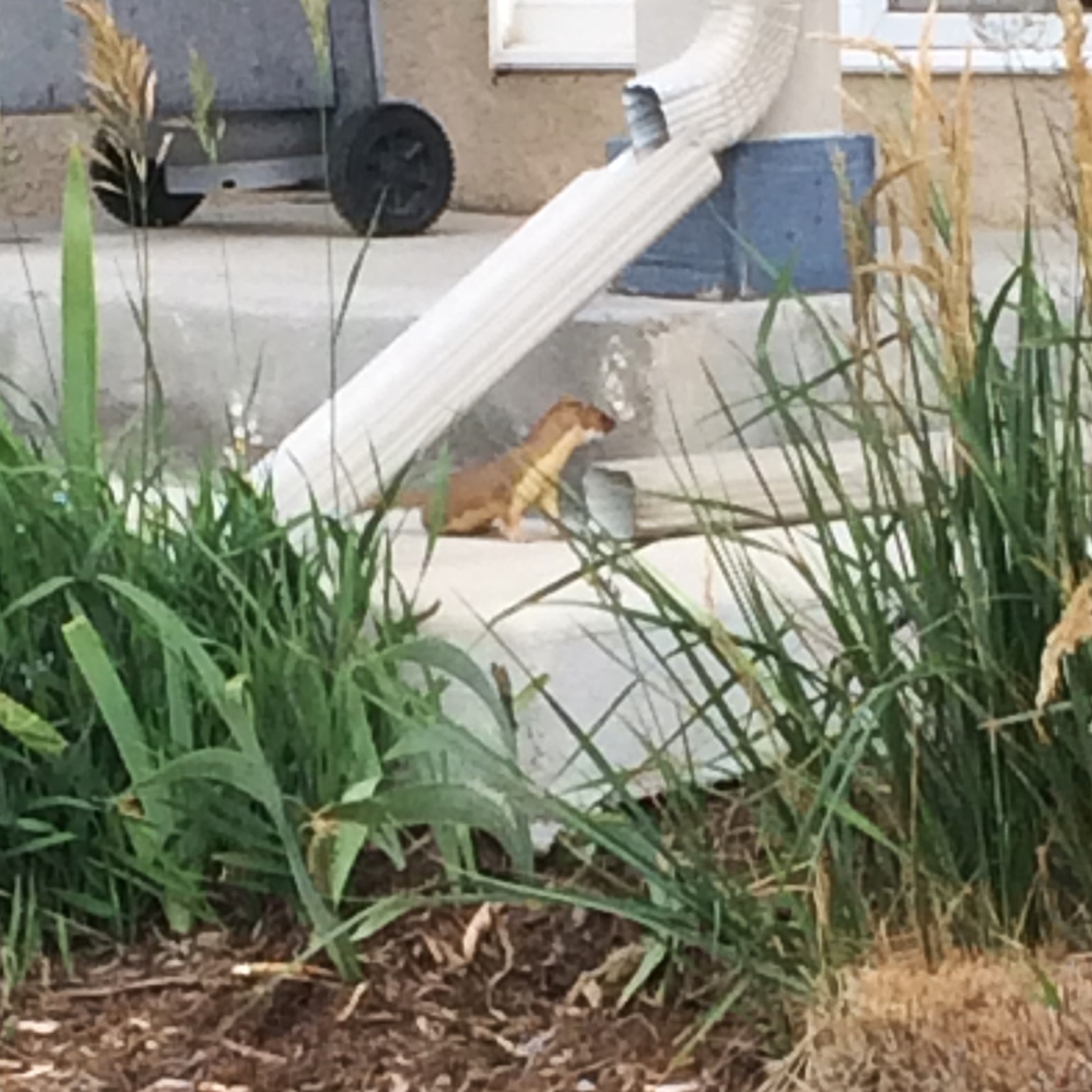 The weasel was brown on top, white below. It had a long tail that stuck straight up as it ran. The whole animal was about 14 inches long, and the tail was five or six inches long. The body was very thin, humped slightly in the middle as it ran, with very short legs.