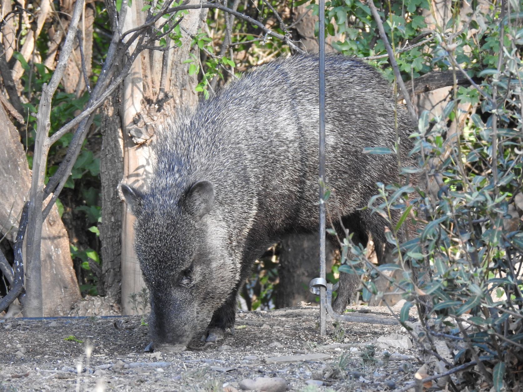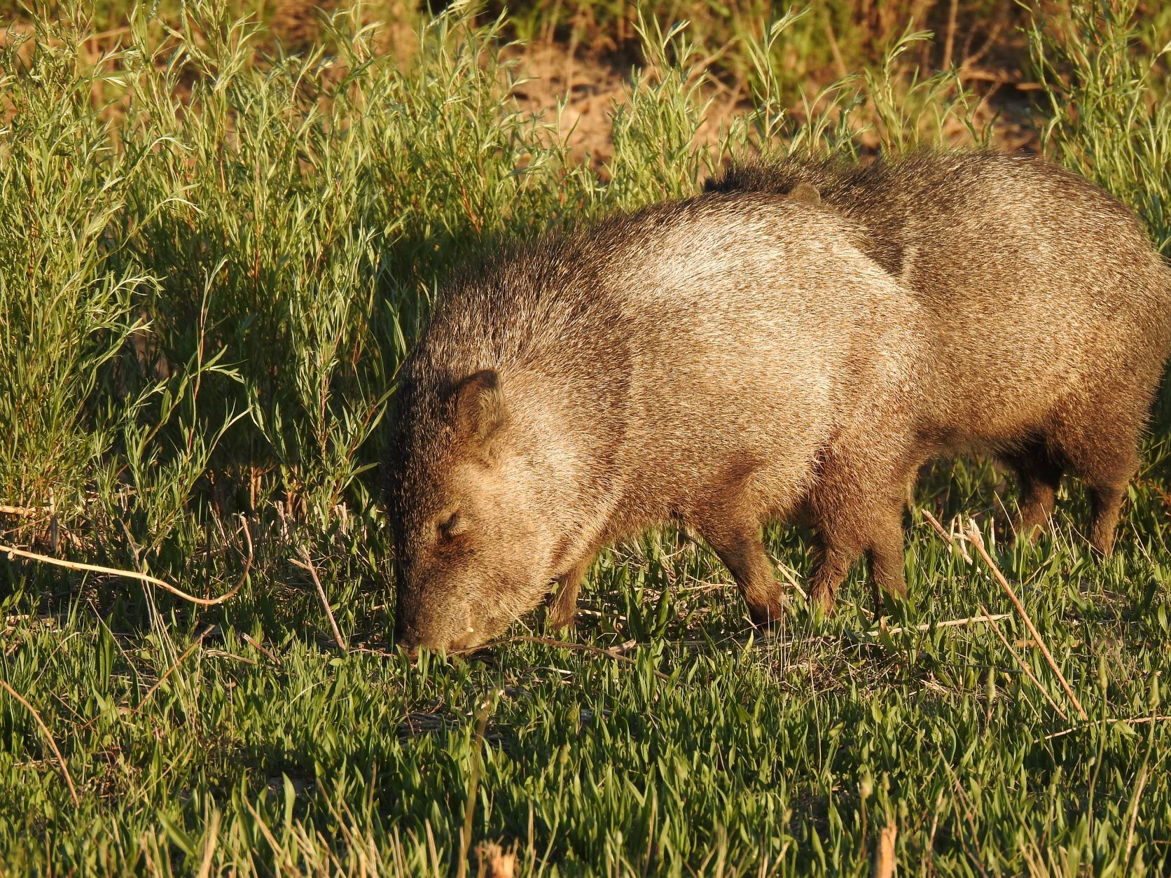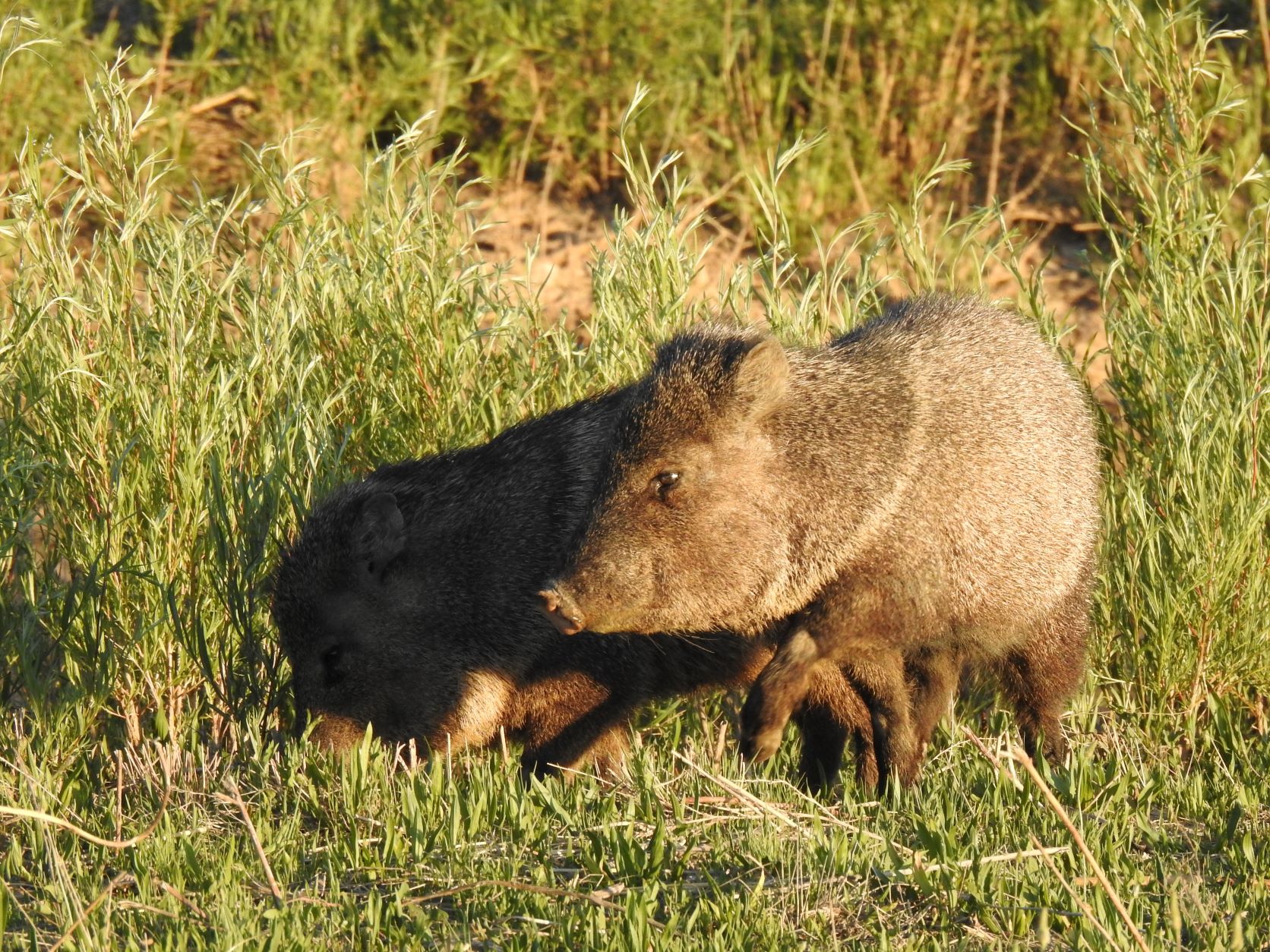 I had just reached the refuge for some early morning birding and was checking in at the self-pay station when I spotted four dark animals about 70 yards away, partly hidden by vegetation. For one brief second, I wondered if they were small bears, but once I looked through my binoculars I knew they were Javalinas.