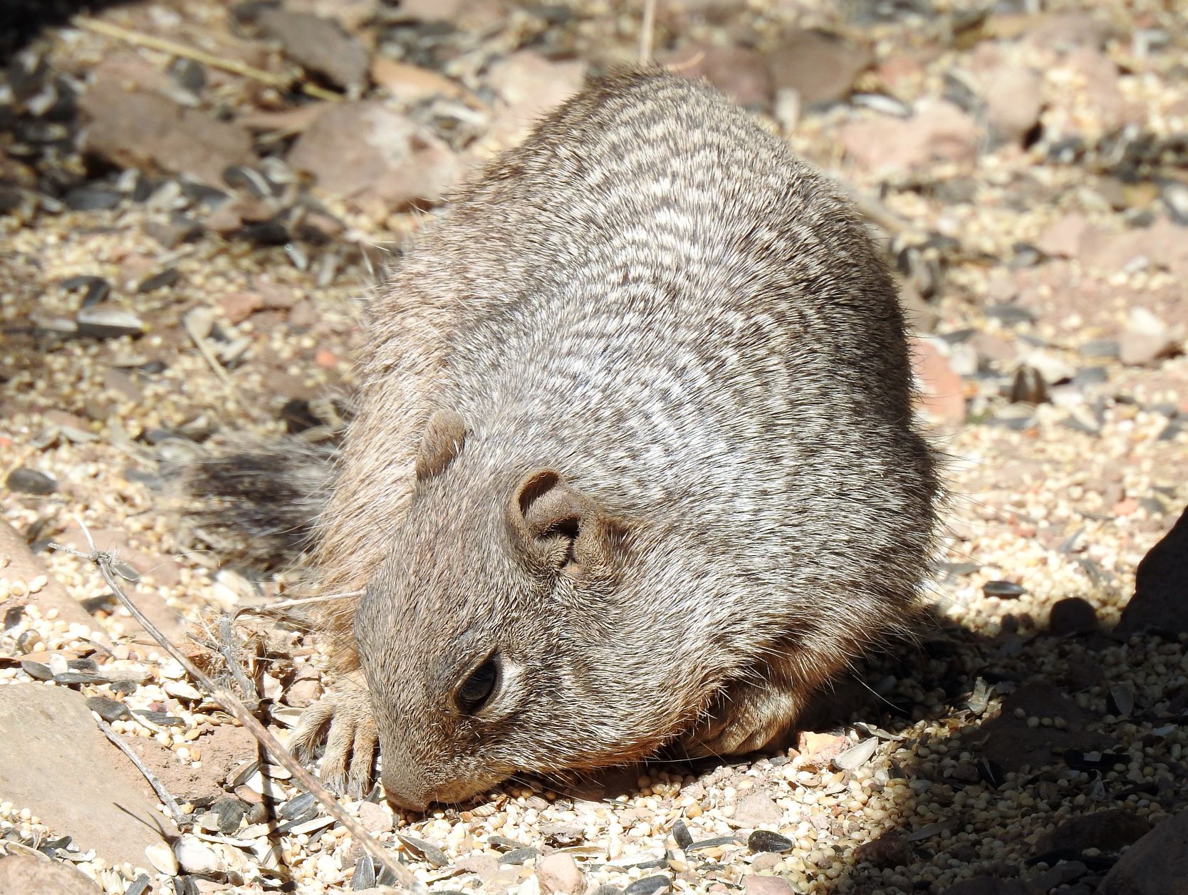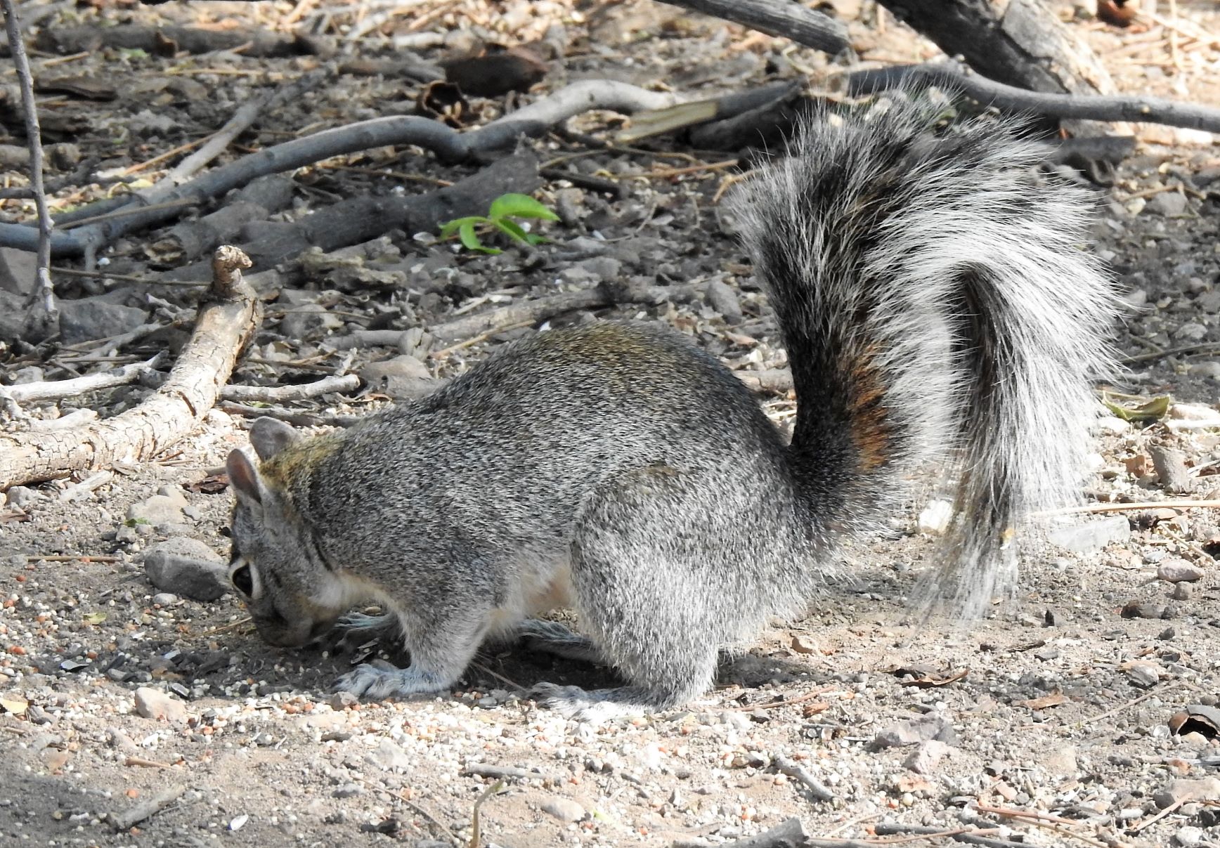 I walked back to the lower feeders and saw two squirrels. One of them was a Rock Squirrel, a large ground squirrel that I’m familiar with from Colorado. It was, in fact, foraging on the ground.