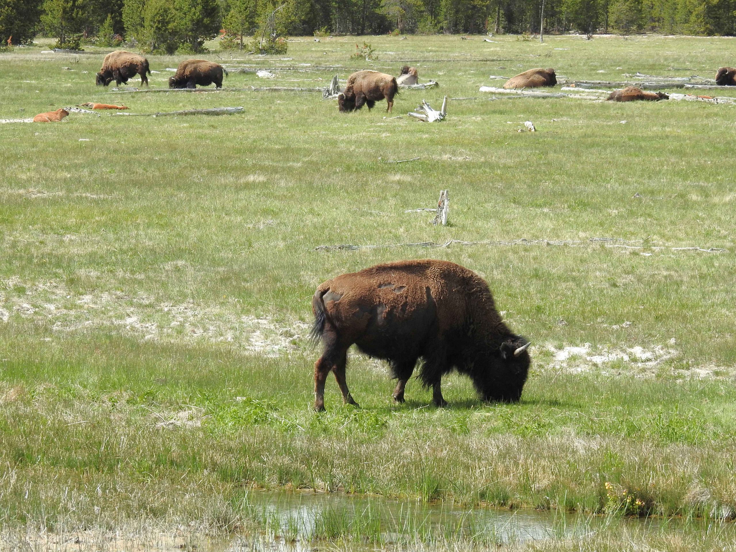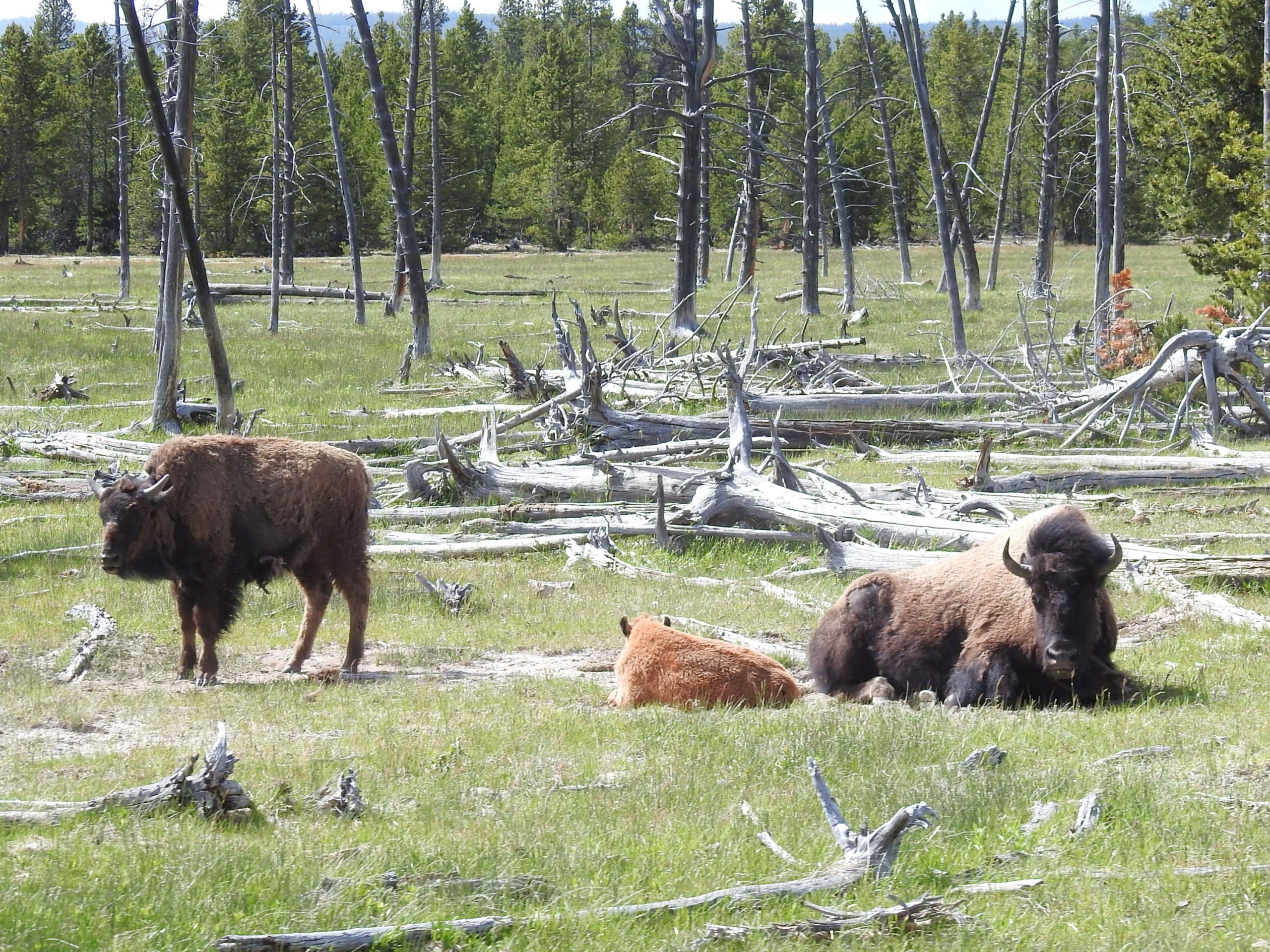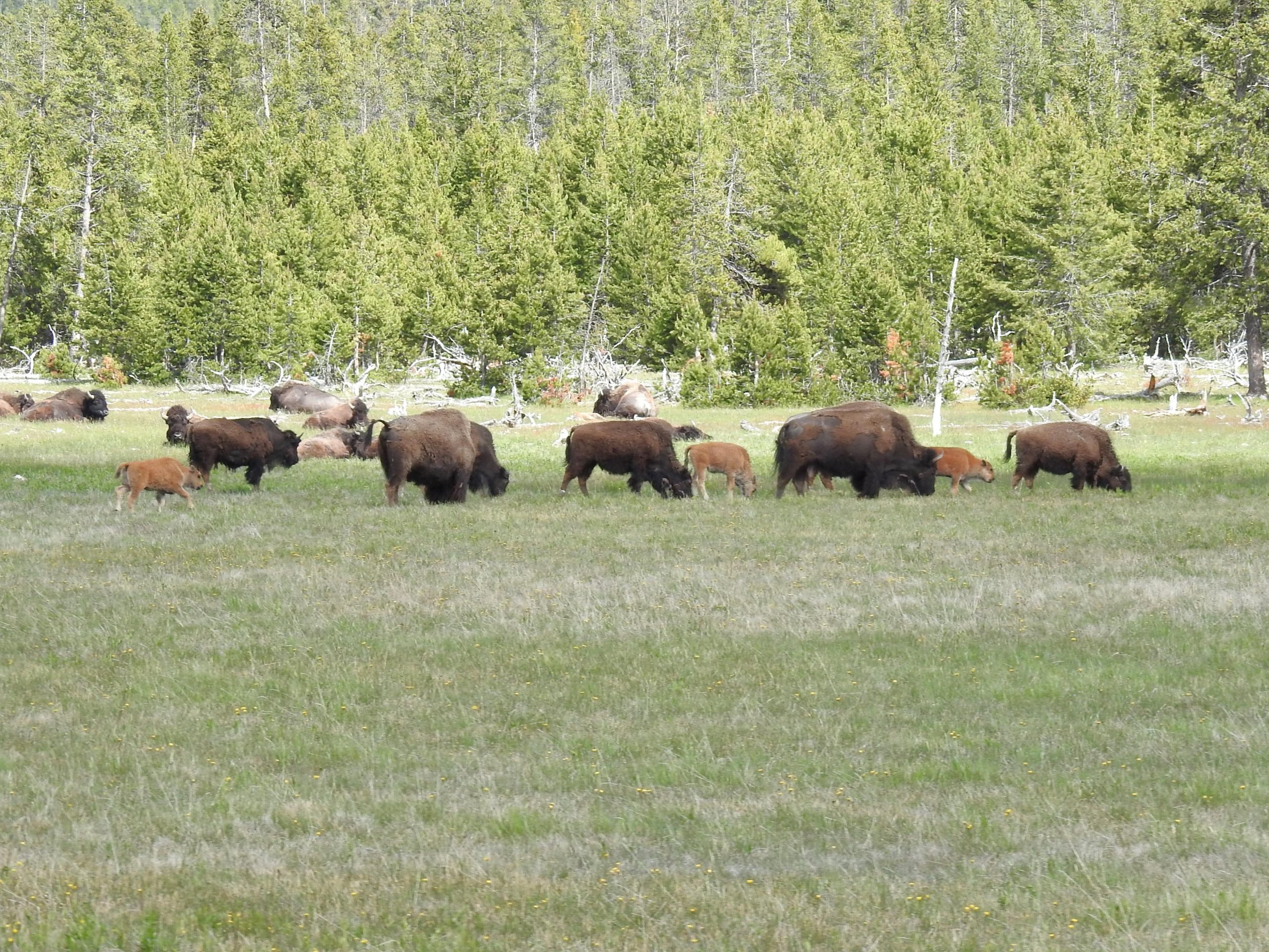 They aren’t hard to see. There are almost 5,000 in the park. I saw individual scattered throughout the northern half of the park — in valleys, on hillsides, in small clearings. Some were alone, some were in loose groups of just a few bison, and some were in big herds. There were a lot of newborn calves around.