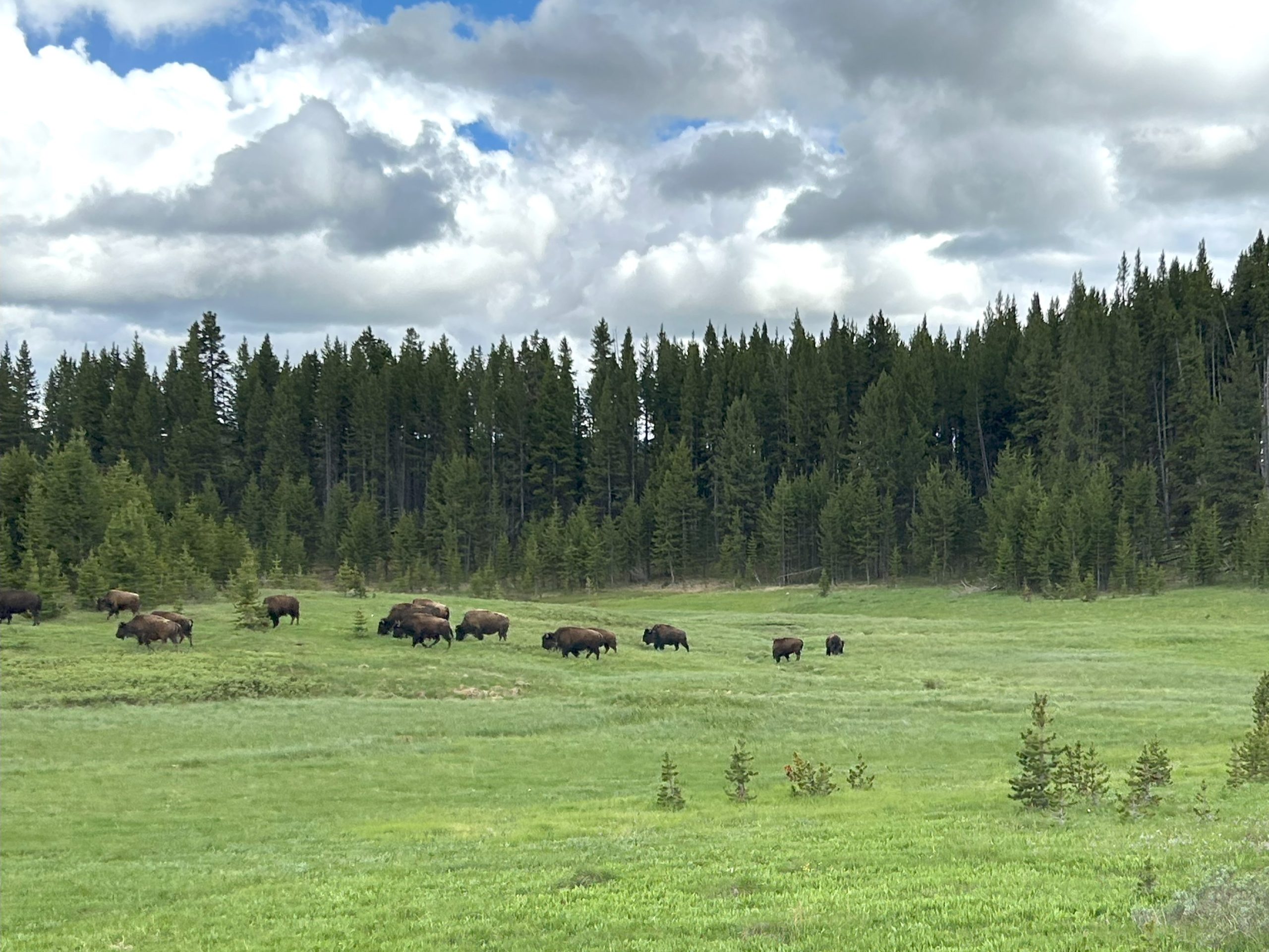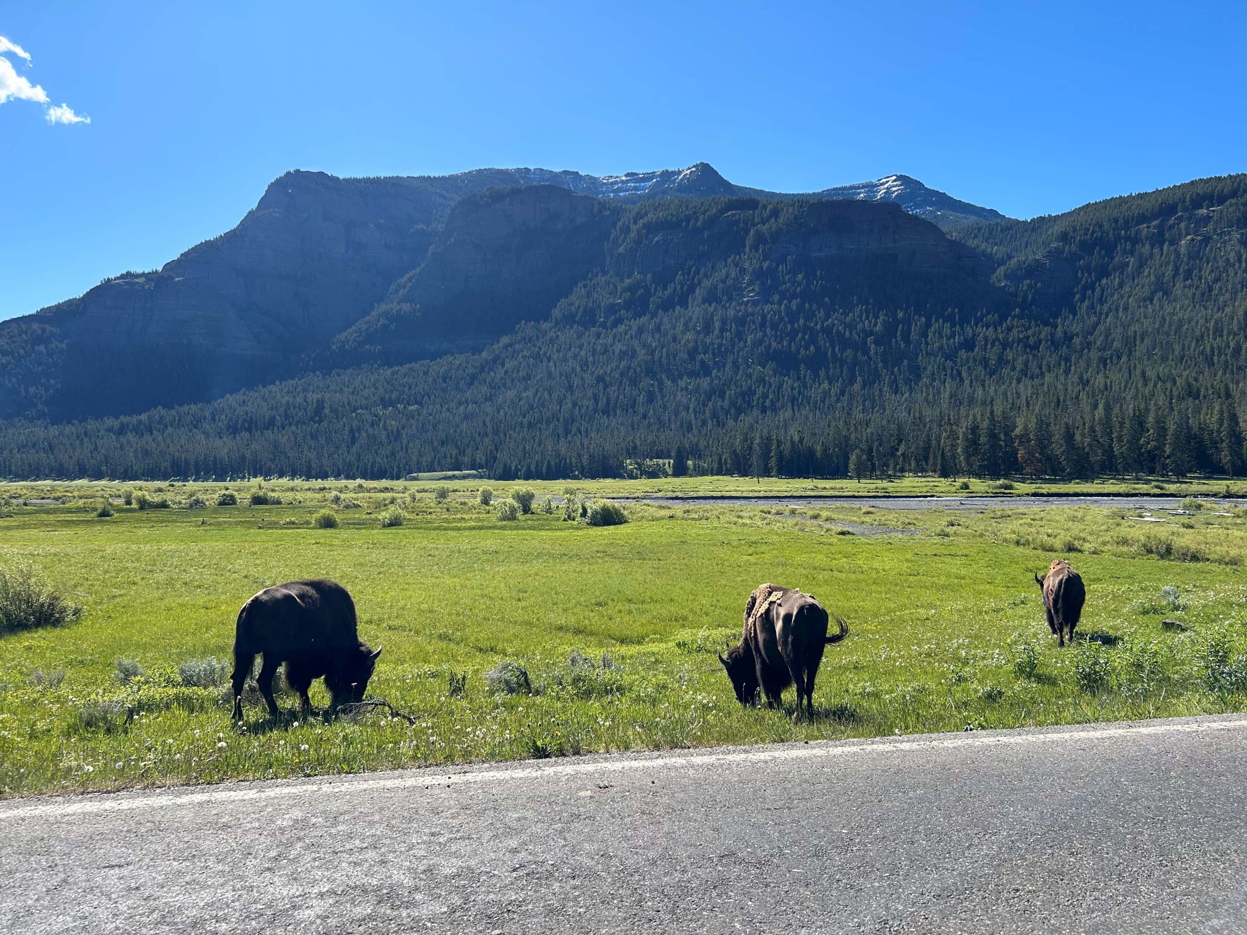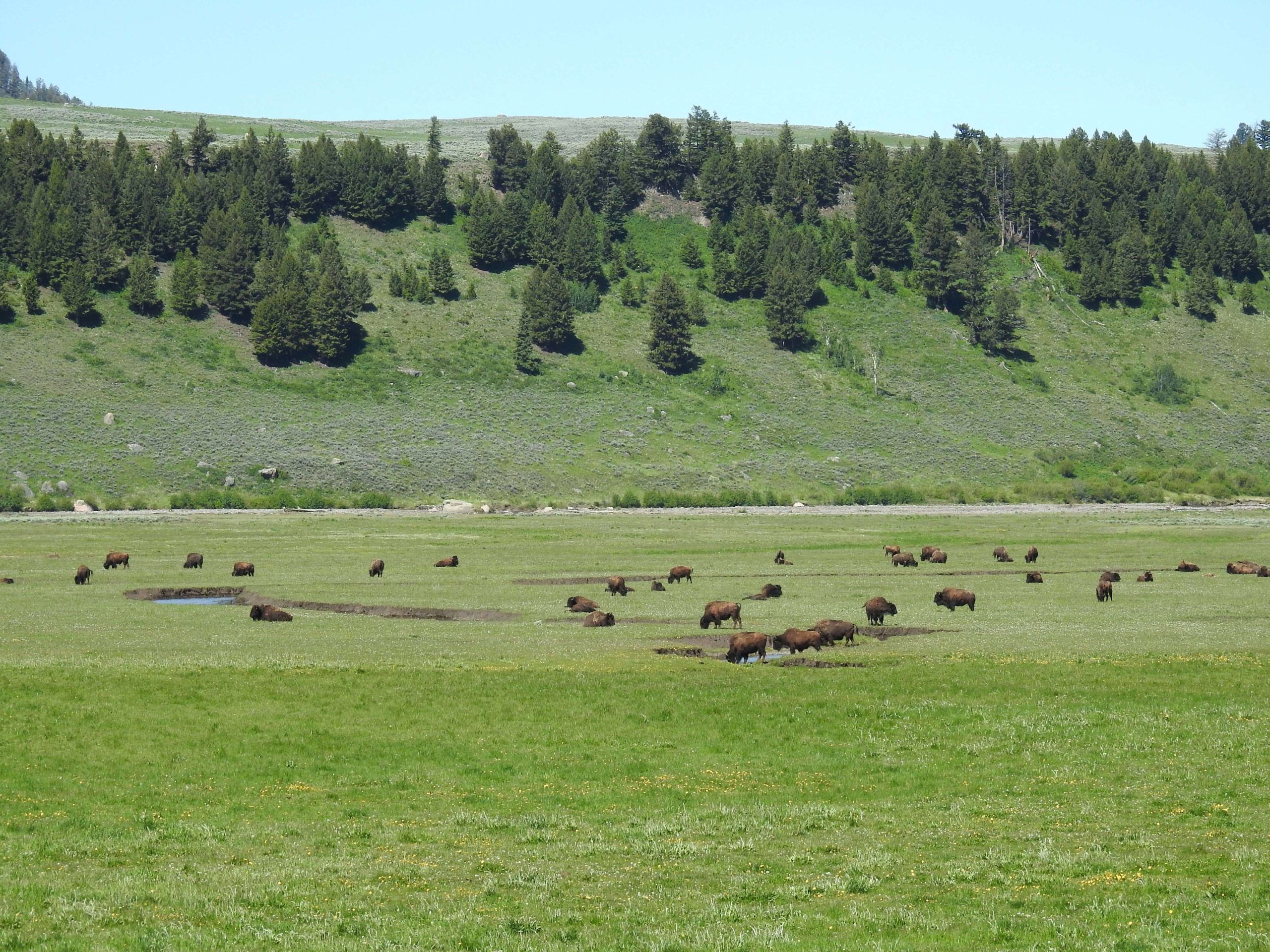 They aren’t hard to see. There are almost 5,000 in the park. I saw individual scattered throughout the northern half of the park — in valleys, on hillsides, in small clearings. Some were alone, some were in loose groups of just a few bison, and some were in big herds. There were a lot of newborn calves around.