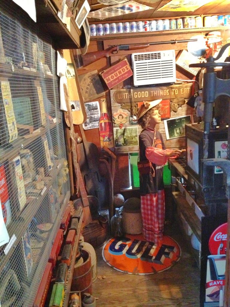 His name is Keith Holt, and it turns out that there is some purpose to the chaos. The shed used to be a Gulf gas station run by Keith’s grandfather. At the same time, in the same building, he operated a barber shop, an apple cider store, and a small diner that served fried chicken. Bits and pieces of this history are mixed in with pieces from Keith’s 20 years in Hollywood as a puppeteer, comedian, some-time actor (he played a Romulan in an episode of Star Trek Next Generation), and model train craftsman. One of his goals is to create a tribute to the tacky and odd roadside attractions that were found around America before the Interstates made travel dull. That explained the souvenirs that were on display. Keith talked very fast and gave us a great deal of information in a very short time.