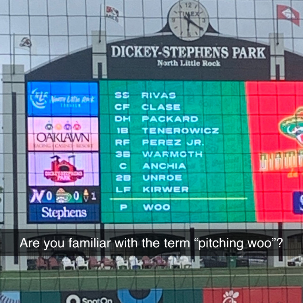 The highlight for me was when I noticed that the Traveler’s pitcher was named Woo. I immediately thought of the old term for flirting, “pitching woo,” but when I cracked the joke, nobody got it. I took a photo of the scoreboard and sent it to several people, but none of them had ever heard the term either. Still, I got a kick out of it. And he pitched a perfect game through six.
