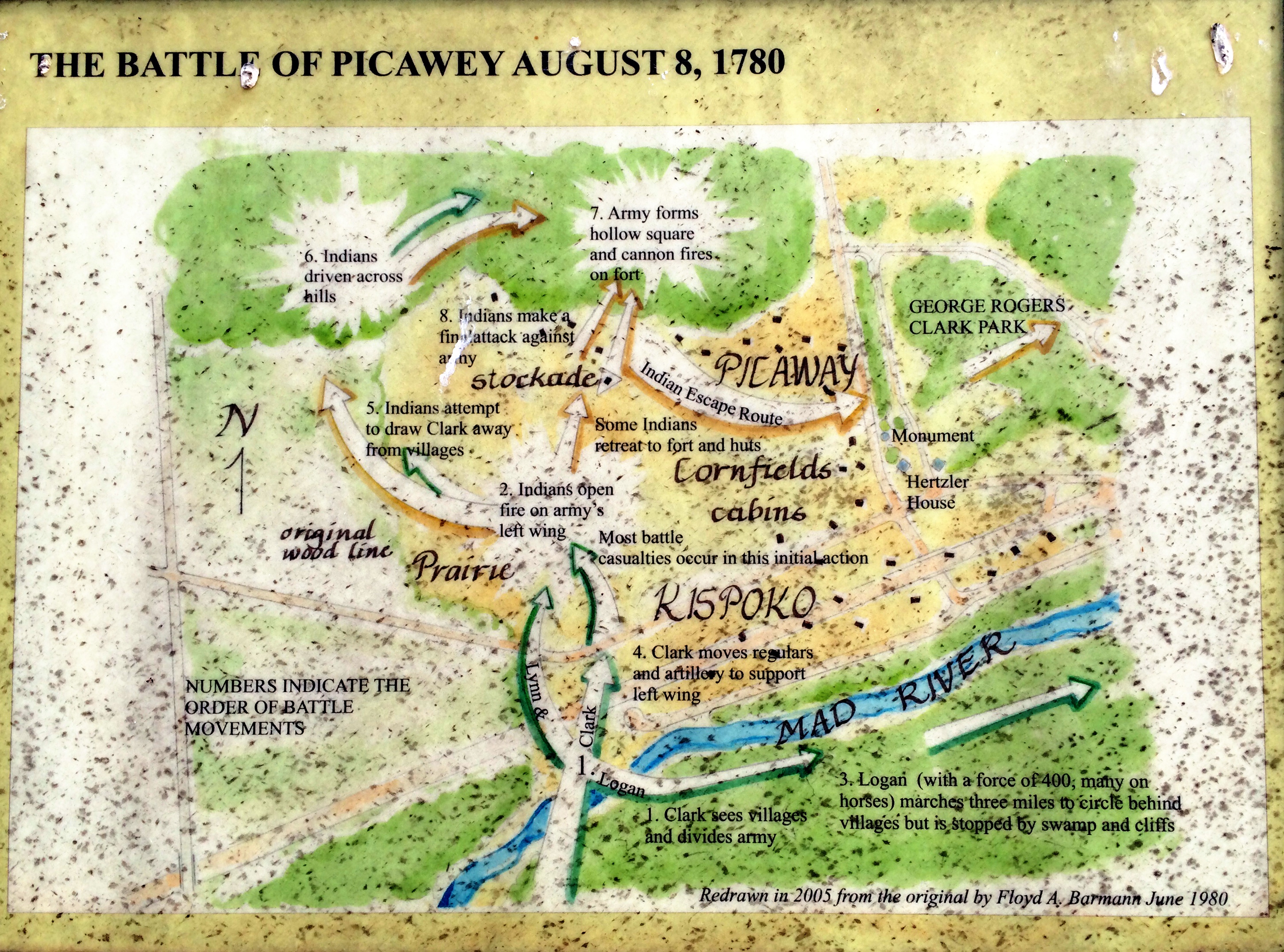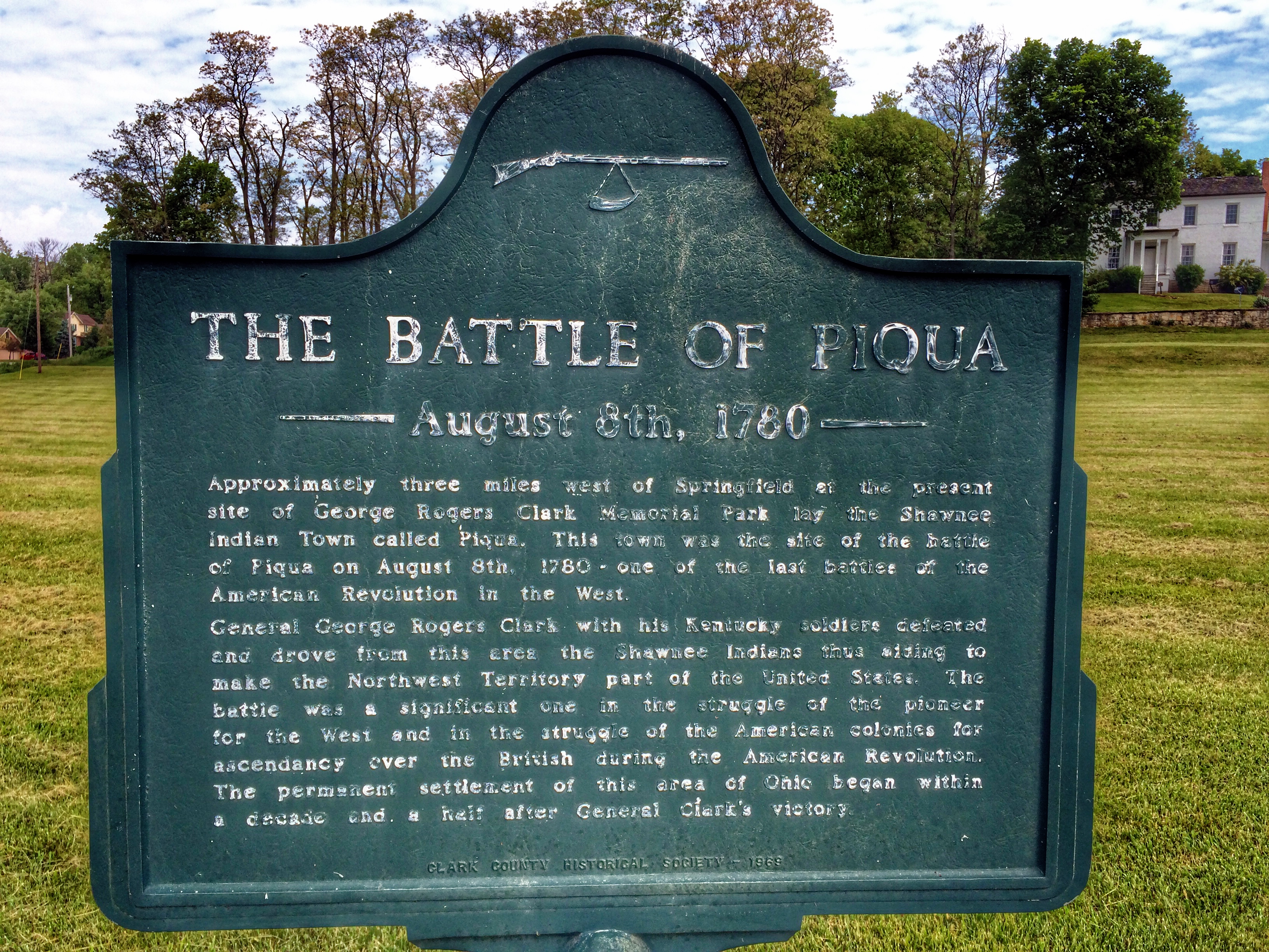 In the summer of 1780, during the Revolutionary War, George Rogers Clark led a band of 1,000 men across the Ohio River into what is now Ohio. Their objective was a series of Shawnee villages. The Indians, allied with the English, were raiding American settlements in Kentucky. The Shawnees retreated before Clark’s force until they reached this spot, the village of Piqua, where the British had built a triangular fort. On August 8, the Americans crossed the nearby Mad River and attacked the village. Fighting continued until Clark brought up his artillery to shell the stockade. The Indians were able to escape because the men who were sent up the river to cut off their route were unable to find a way through a swamp in time.