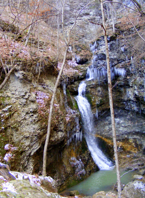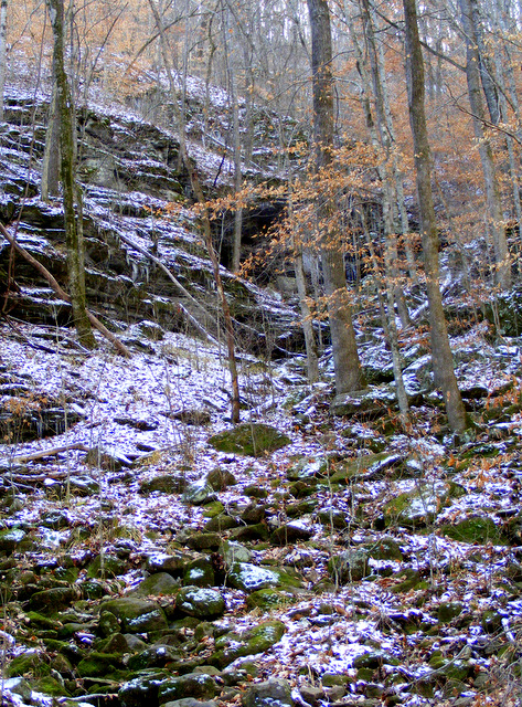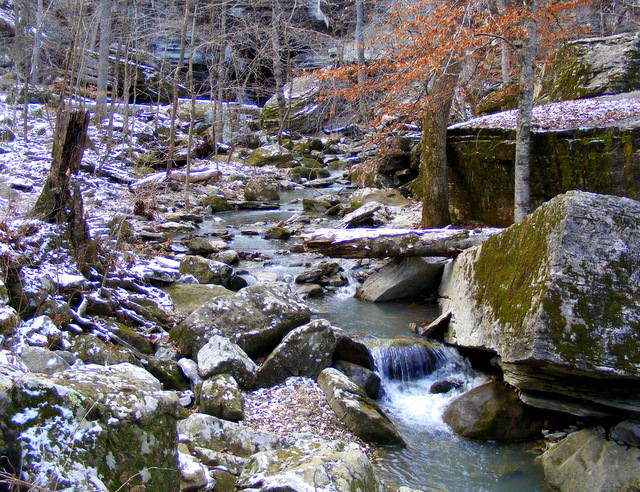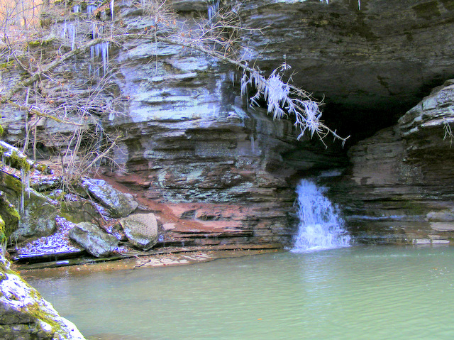 Lost Valley, near Ponca, Arkansas, is part of the Buffalo National River. None of us had ever been there before or knew much about it. When we first started walking the trail, it didn’t seem very exciting. The first “waterfall” looked like this. That’s Clark Creek, which disappeared underground at several points in the valley.
