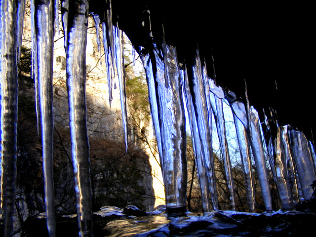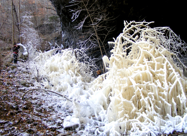 Underneath the valley wall was a large scooped out area that formed a huge cavern. Water was dripping from the cliff and landing on the ground and trees. The resulting ice formations were amazing.