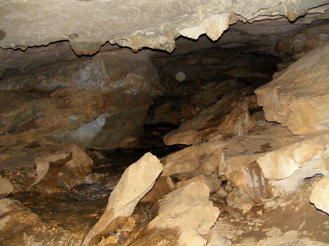 The cave ceiling is rather low near the entrance. Supposedly it opens up further back, where the creek forms a 30-foot waterfall. I tried to make my way back to see it, but without a flashlight it soon got much too dark. I even had to use the flash on my camera to see well enough to return to the entrance. Here’s a flash photo I took inside the cave.