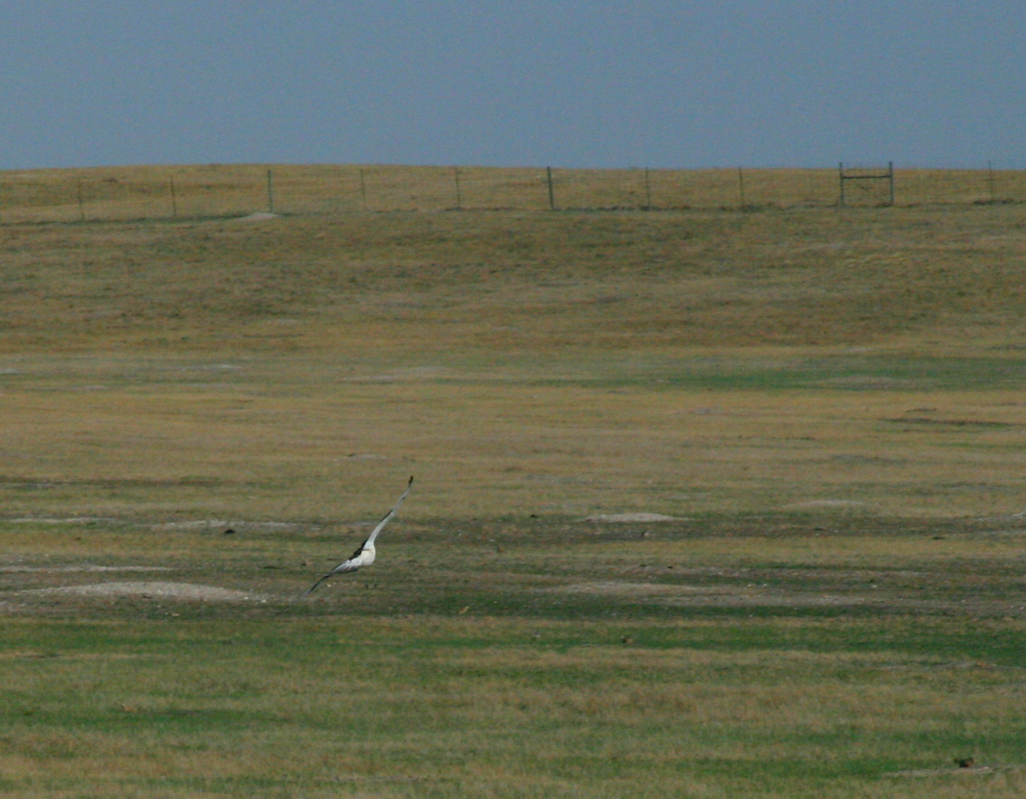 A large hawk suddenly appeared off to the west, flying low. It was about 100 yards off, but I could see it well enough to get excited. I didn’t have my binoculars — they were in their case in my briefcase in the closed trunk of my car 30 feet behind me. I zoomed my camera all the way and took picture after picture as it quartered over the prairie dog town. Ferruginous Hawks eat prairie dogs, so I’m sure it was hunting.