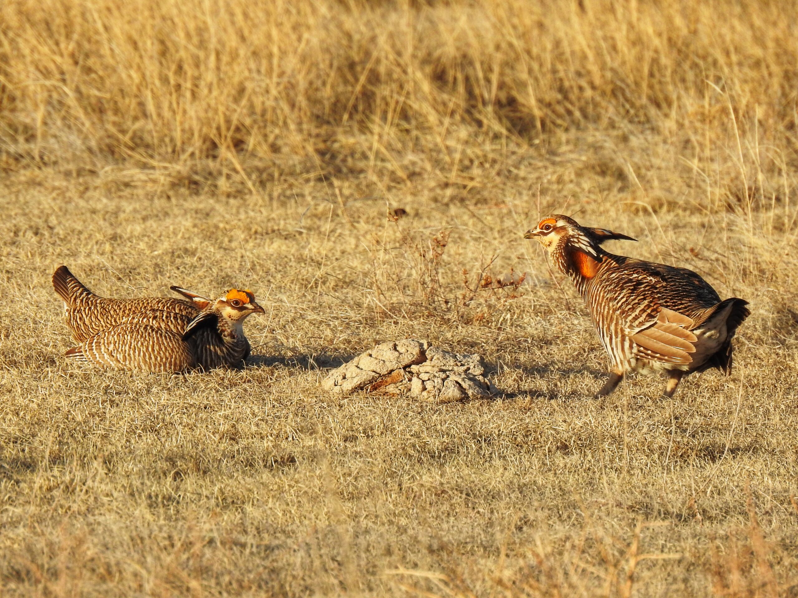 The Greater set up shop right in the middle of the lek, closest to the trailer, and defended his territory with vigor. Apart from the actual field marks, we could identify the Greater because he was missing a tail feather. Jim said there was one Greater on this lek last year that was also missing a feather, and he’s positive its the same bird. Greater and Lesser Prairie-Chicken ranges only overlap in a very small area in this part of Kansas. They occasionally hybridize. This guy didn’t act like he was aware he was in the wrong lek.