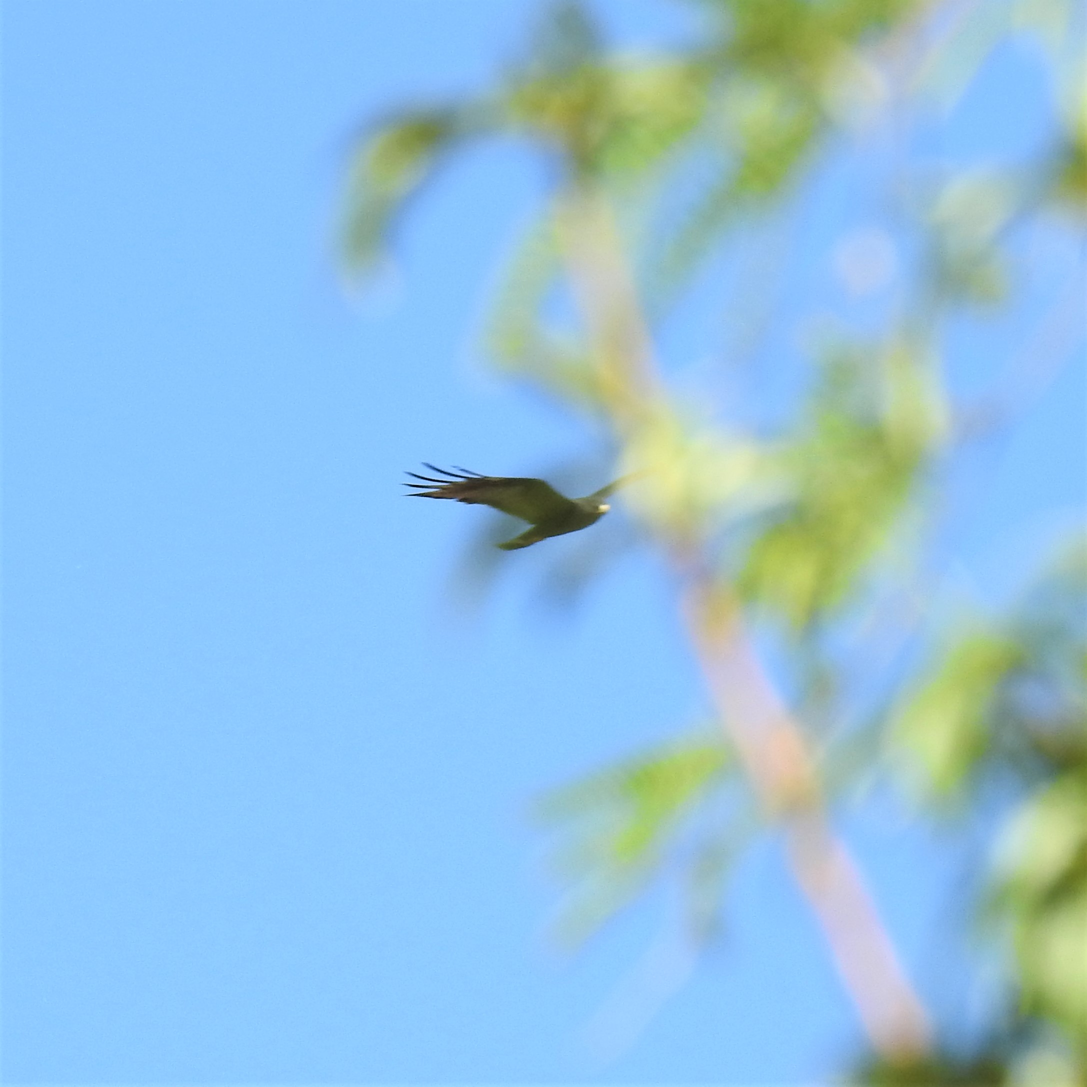 When the young guy at Paton’s pointed out the Violet-crowned Hummingbird, I told him I admired his bird-summoning skills and asked if he could summon a Zone-tailed Hawk. He laughed and said he’d go scare one up for me. He told me they’re often seen right over the center. Not 10 minutes later, I saw a hawk circling fairly low overhead and knew immediately that I’d finally seen a Zone-tailed Hawk. I jumped up with my camera, but it was moving fast, disappearing and reappearing behind the tall cottonwoods. It probably stayed in the neighborhood for 10 minutes. Twice that afternoon it came into view. These are the best photos I could get.