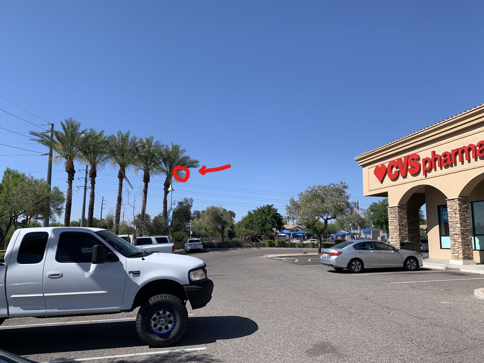 But I was there, and the bird was there, so I decided to get it done. I checked eBird and saw that Rosy-faced Lovebirds nested in the palms in front of a CVS pharmacy a mile down the road from my hotel. I drove down there and stood in the parking lot while a homeless guy looked on.