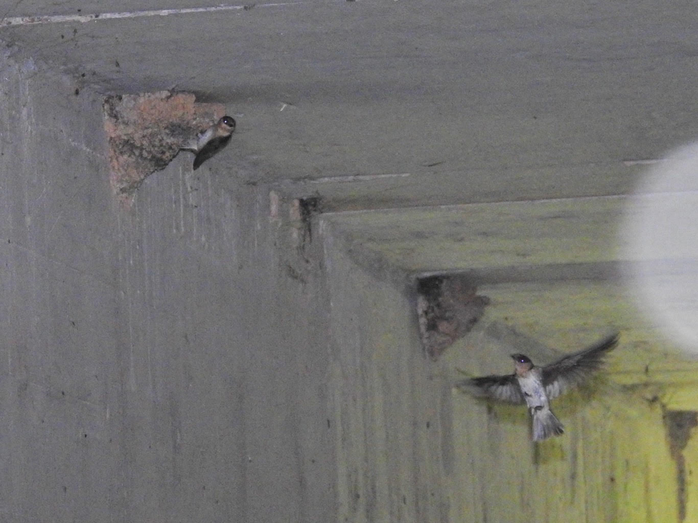 I spent the next 45 minutes watching them and trying to get decent, identifiable photos. There were maybe 45 birds wheeling overhead. There were tall woods on either side of the highway, and the flock was often above tree level — sometimes way above tree level. Other times, they came down lower and swirled about over the highway. Occasionally one would dive down into one of the five culverts under the bridge. Four college-age kids parked by my car and went down into the creek. I didn’t ask them what they were doing, but it looked like some sort of research, perhaps as part of their studies. They weren’t there to see the swallows. After they left, I climbed down the bank and looked into three of the five culverts. Each of them had five or six mud nests (see the photo), not all bunched together like Cliff Swallow nests sometimes are, but not far apart either.