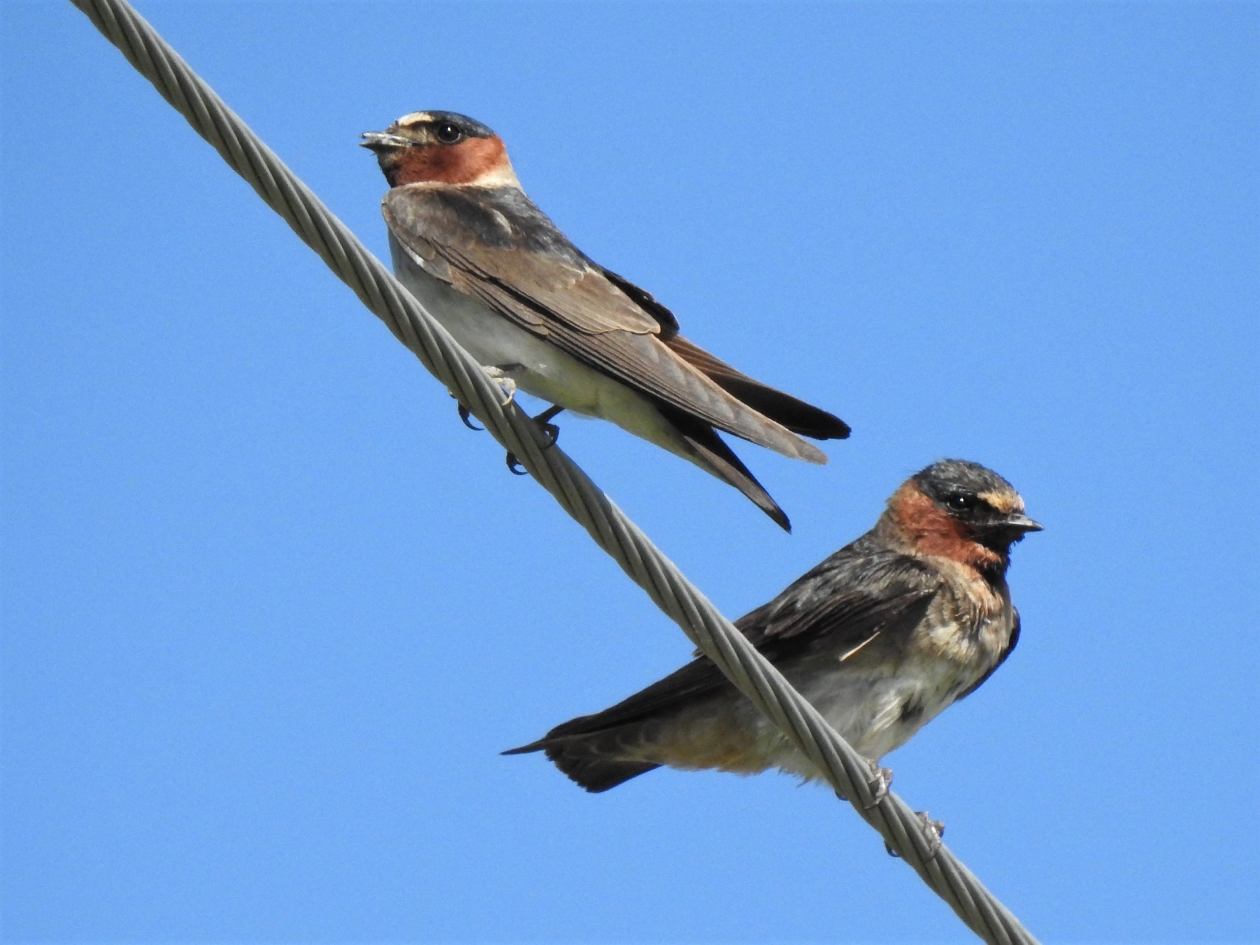 As I mentioned, Cave Swallows look a lot like Cliff Swallows, which I’m very familiar with. They had the same basic coloring, the same body shape and size, and very similar calls. Cliff Swallows have dark throats and white foreheads. Cave Swallows have pale orange throats and darker orange foreheads. For comparison, here’s a photo I took of a couple Cliff Swallows two years ago in Colorado.