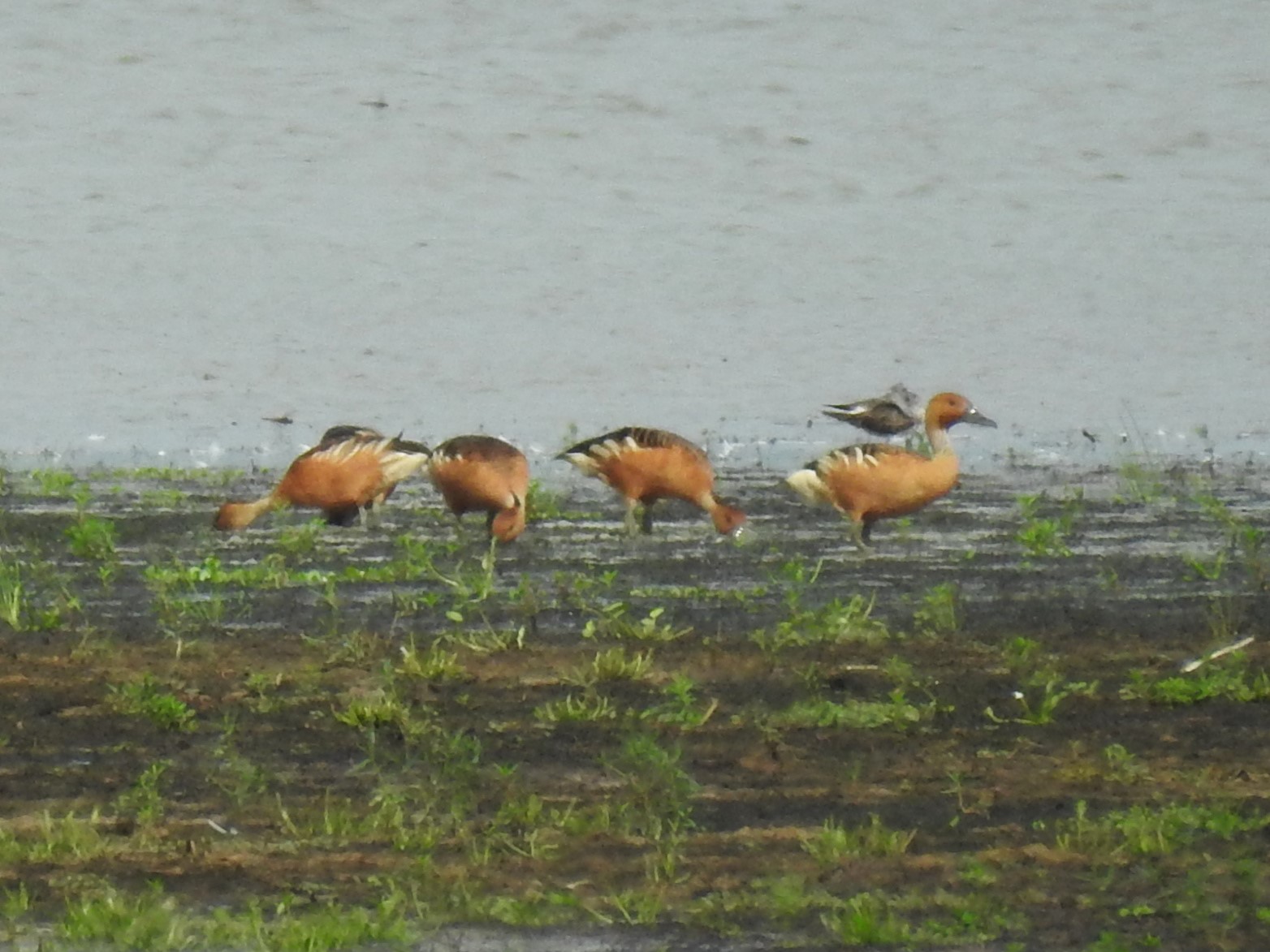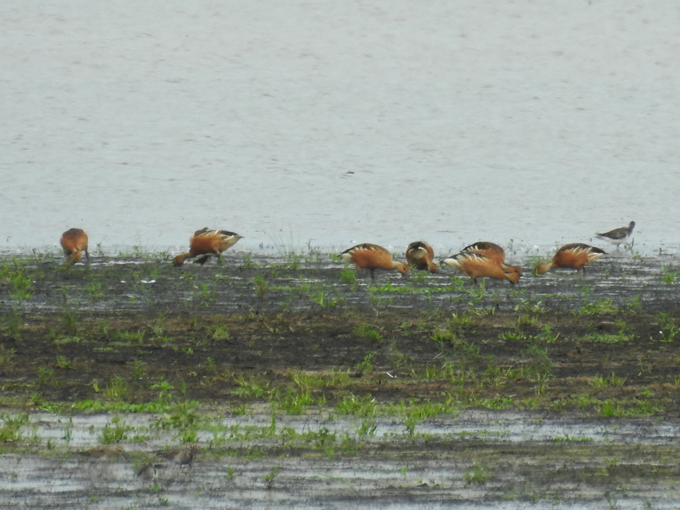 Two of the ducks were foraging along a large mudflat in the middle of the cell. I took some photos, but the birds were a long way off and the light wasn’t optimum. I drove around to the west end and soon saw another group of six not far away from the first two. The two groups slowly wandered closer to each other, feeding as they went. They usually had their heads down, but occasionally one would look up alertly. Another birder came by, and while we were talking the flock flew further away to the far edge of the cell. I saw them briefly in flight but didn’t get good looks or photos. They seemed to settle in in their new location, perhaps for the night, as they were still in the same place an hour later when I left.