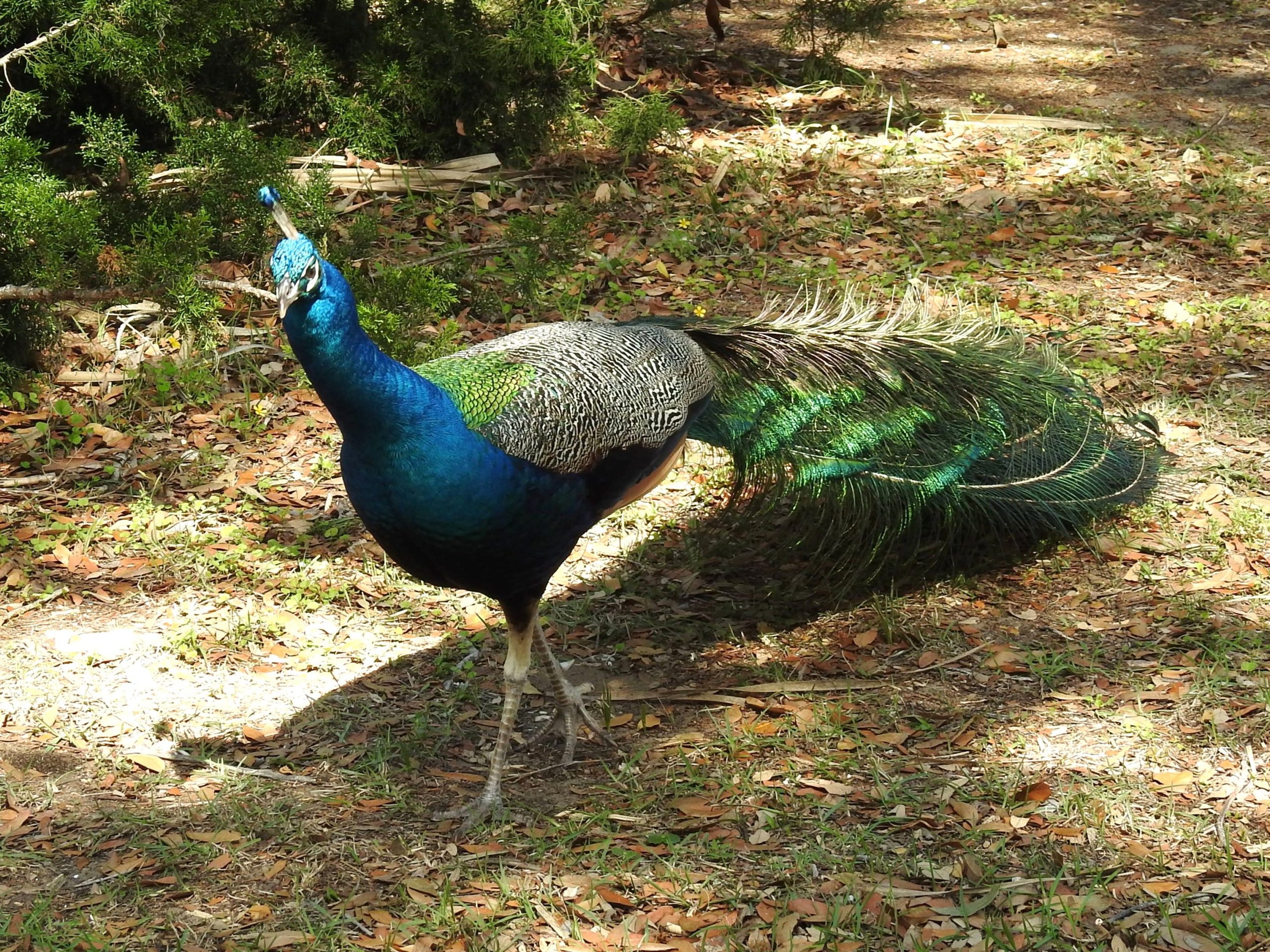 The Ribault Club is a resort from the 1920s, restored as part of a state park and open for events and weddings. Except on the day I was there. It’s also a place where peafowl are reported regularly. The parking lot was open, so I figured it was OK for me to walk the grounds. I wasn’t out of the car for a minute before I heard a peacock give it screeching cry. A minute later I found it – on the roof the building. We stood and looked at each other for a few minutes, and then I wandered the grounds looking for other birds.