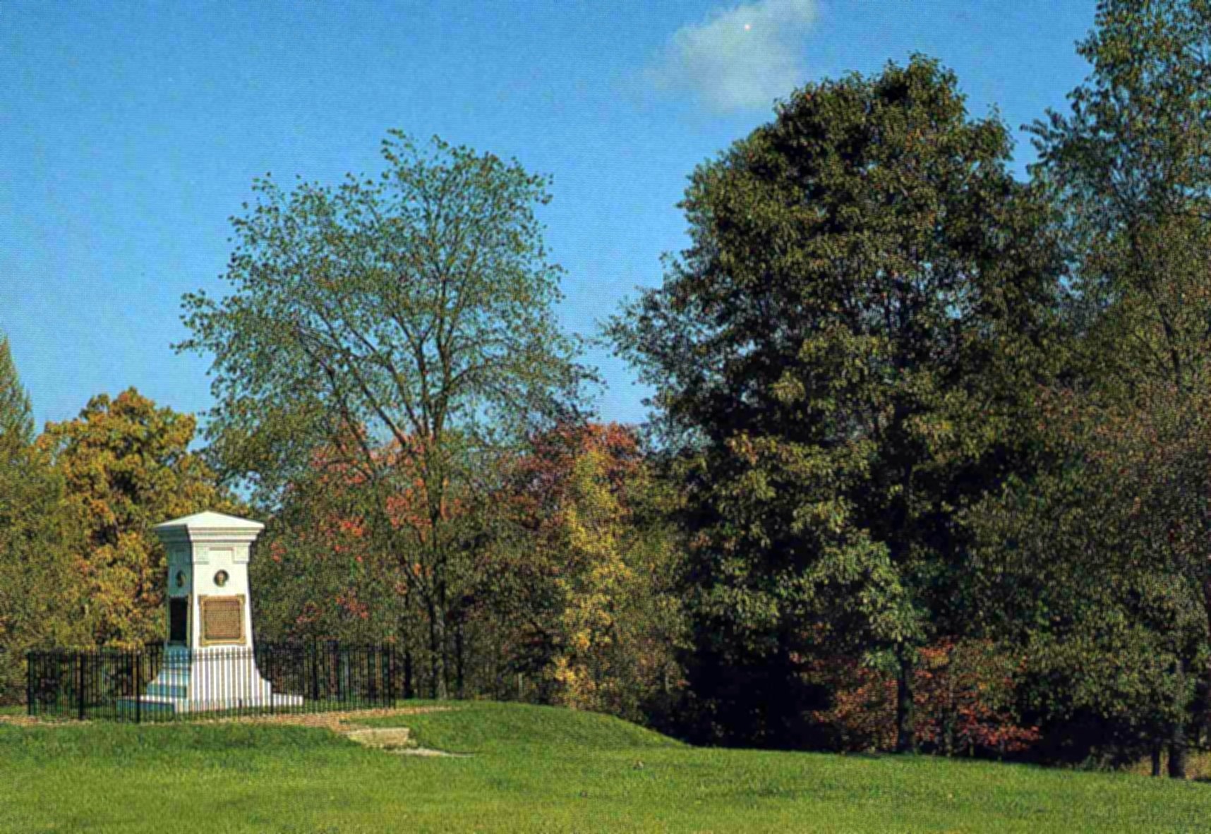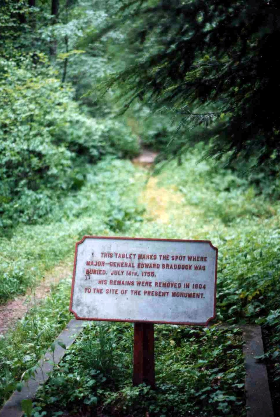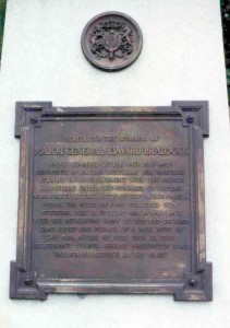 On July 9, 1755, British Major General Edward Braddock led an expedition to try to capture Fort Duquesne, a French fort located where Pittsburgh now stands. His force, which included George Washington, was attacked by French soldiers and their Indian allies and nearly wiped out. After fighting for several hours, the army retreated. Braddock was wounded and died on July 13. To keep the enemy from finding his body, he was buried on the road the troops had made on the outward journey. The army marched over his grave to pat down the dirt. A body, which might have been Braddock’s was discovered in 1804 and reburied on the knoll where the monument stands.