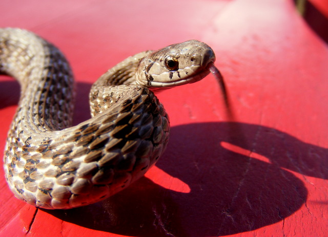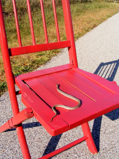 I spotted the largest Brown Snake I’ve ever seen on the trail at Moraine Hills State Park — it was about 14 inches long. I picked it up and held it on the seat of the chair. It writhed around and looked aggressive, but never tried to bite me.