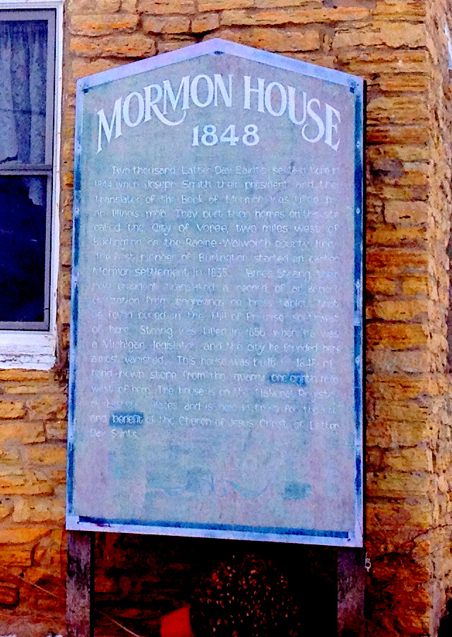 While in the Chamber of Commerce, I picked up a booklet on Burlington. Under “Historical Sites” it listed the Voree Strangite Mormon Settlement. We drove about a mile south of town and found two buildings along a country road. This house, with an indecipherable sign on the front …