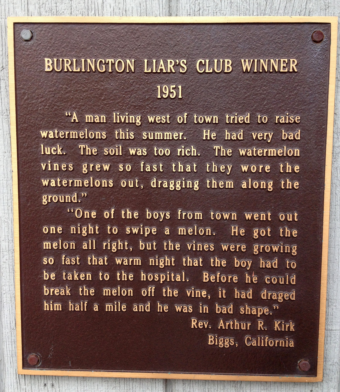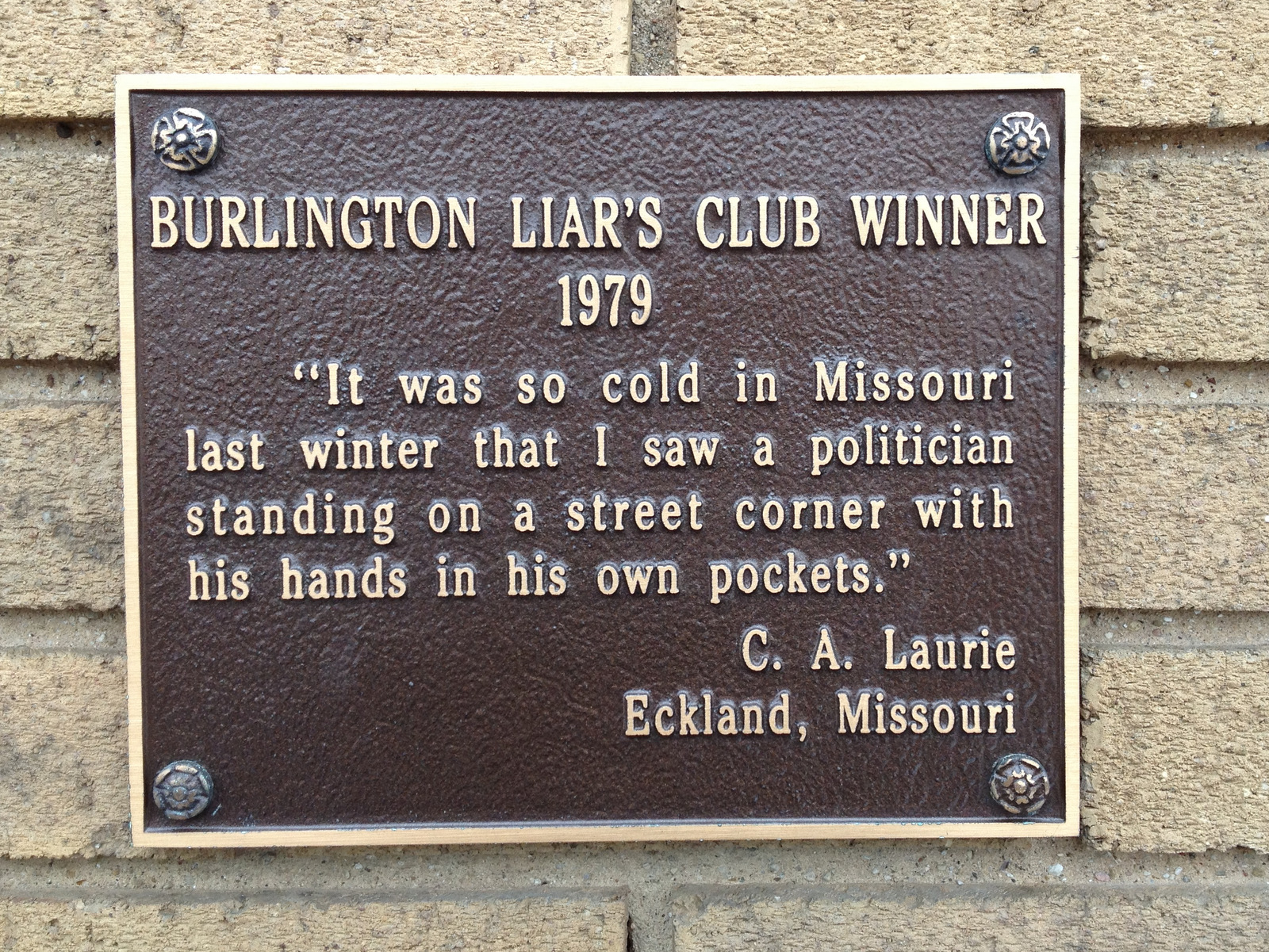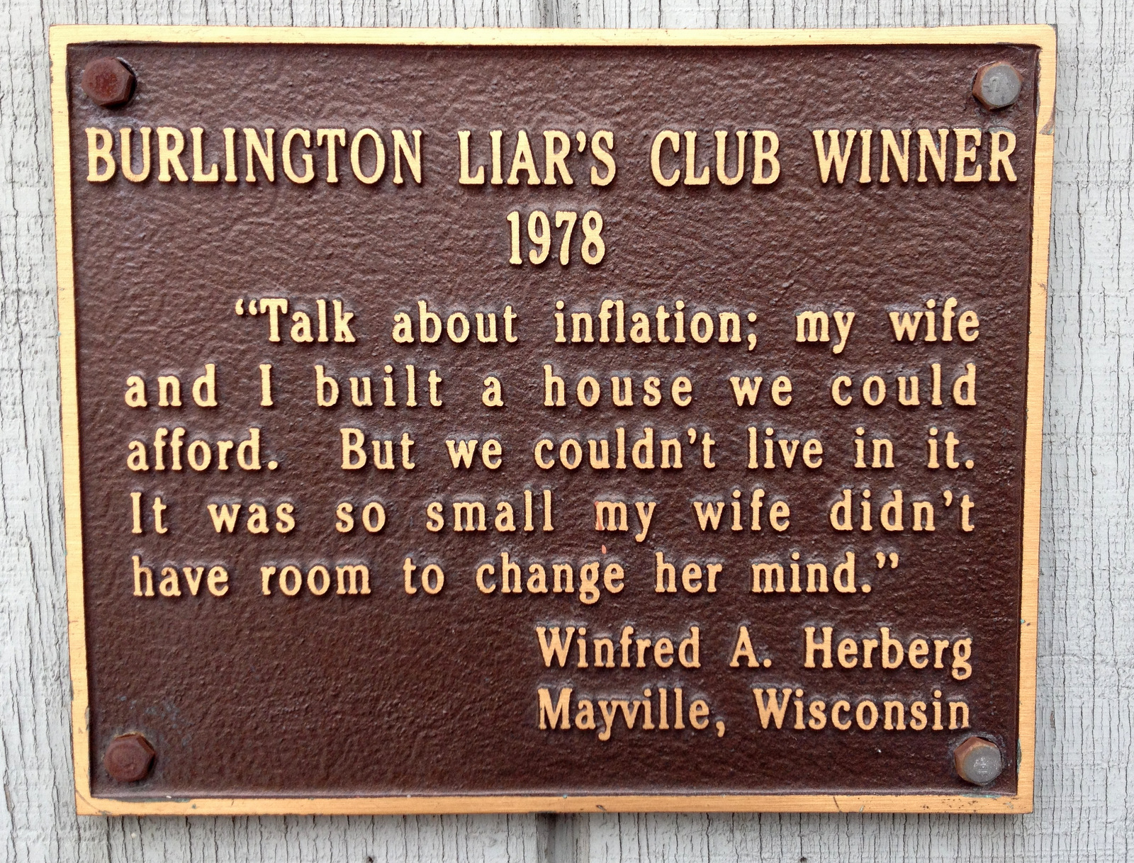 The Burlington Liars Club was founded in 1929 when two bored reporters fabricated a news story about a lying contest between the police and fire departments. Each year since, there’s been contest for champion liar and the winning entries are posted on plaques around town.
