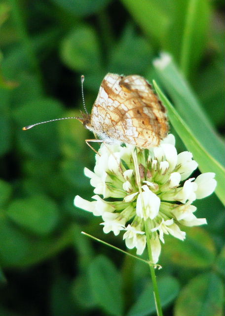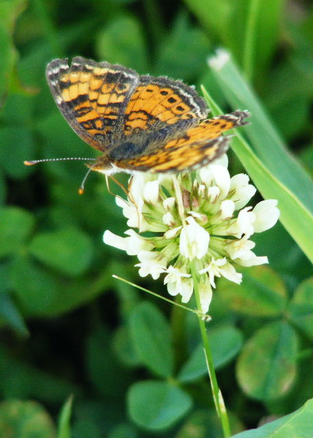This tiny butterfly was flying low over the mowed horse-trail through the prairie along the back of the housing development. I watched as it crawled over a series of white clover flowers, often tilting back and forth in the breeze. It usually had its wings open, and it was some time before I was able to see the crescent on its under-wing.