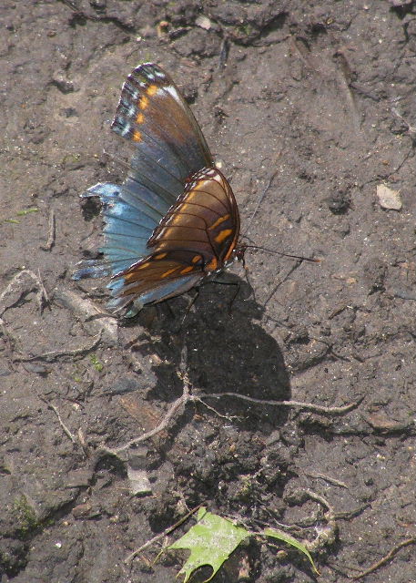 I was walking the trail through the oak woods on the rise above the pond when I spotted this butterfly. It’s wings were considerably chewed up, and I even think it limped when it walked. But it was still capable of flying low and erratically from sunny spot to sunny spot. I caught a brief glimpse of orange spots on the underside of its wings, but in the shade this was the only photograph I managed. It’s a very beautiful butterfly when in its full glory, so hopefully better photographs are coming.