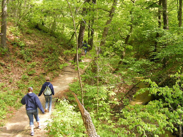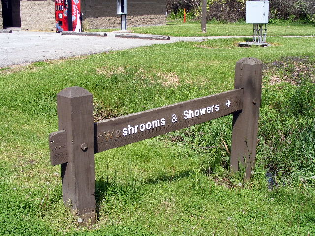 We got back to our campsite a little before noon. The standing water was gone but the ground was still muddy. After a quick lunch, we set up camp in what dryish spots we could find. Allow me to say a quick word about camping at an Illinois State Park. Don’t. To begin with, it takes about an hour to get checked in. And then there’s the bathroom facilities. Our section of the campgrounds had about 50 spaces, most of them filled, and one bathhouse, most of the time closed. And so what did we have? Four porta-potties, lined up next to each other and located about 150 yards from our campsite. Delightful.