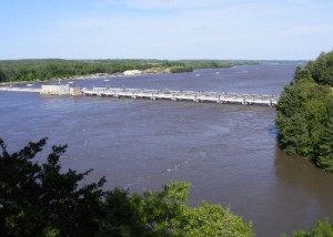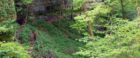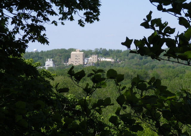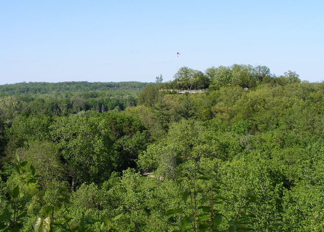 Since we’d gone this far, we decided to walk down a truckload of stairs, across a short valley and up another truckload of stairs to the top of Starved Rock itself. The name of the rock comes from a mostly-legendary battle that may have taken place in 1769. Supposedly, a member of the Illiniwek people murdered Chief Pontiac of the Ottawa. The Ottawa and their allies, the Potawatomie, seeking revenge, besieged the Illiniwek, who had taken refuge on the rock, and starved them out. The shot on the left shows the rock as seen from the lodge. The other two shots were taken from the top of the rock. In the one on the right, you can see the visitor center where we spent much of the previous afternoon in the rain.