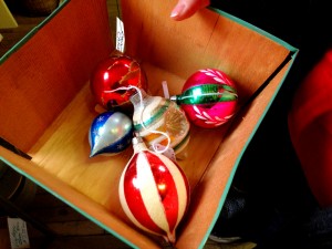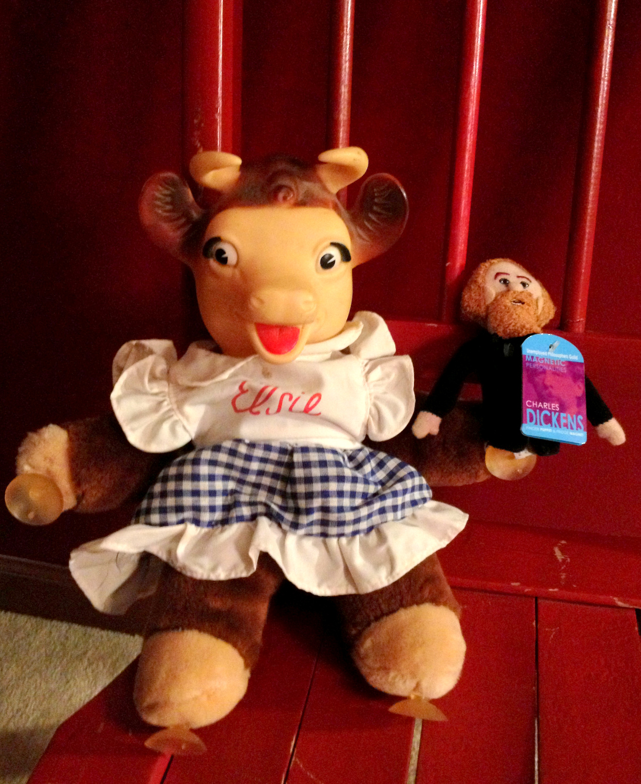 My wife bought some old, glass Christmas ornaments. I bought an Elsie the Cow doll to go with my Elsie the Cow sign.