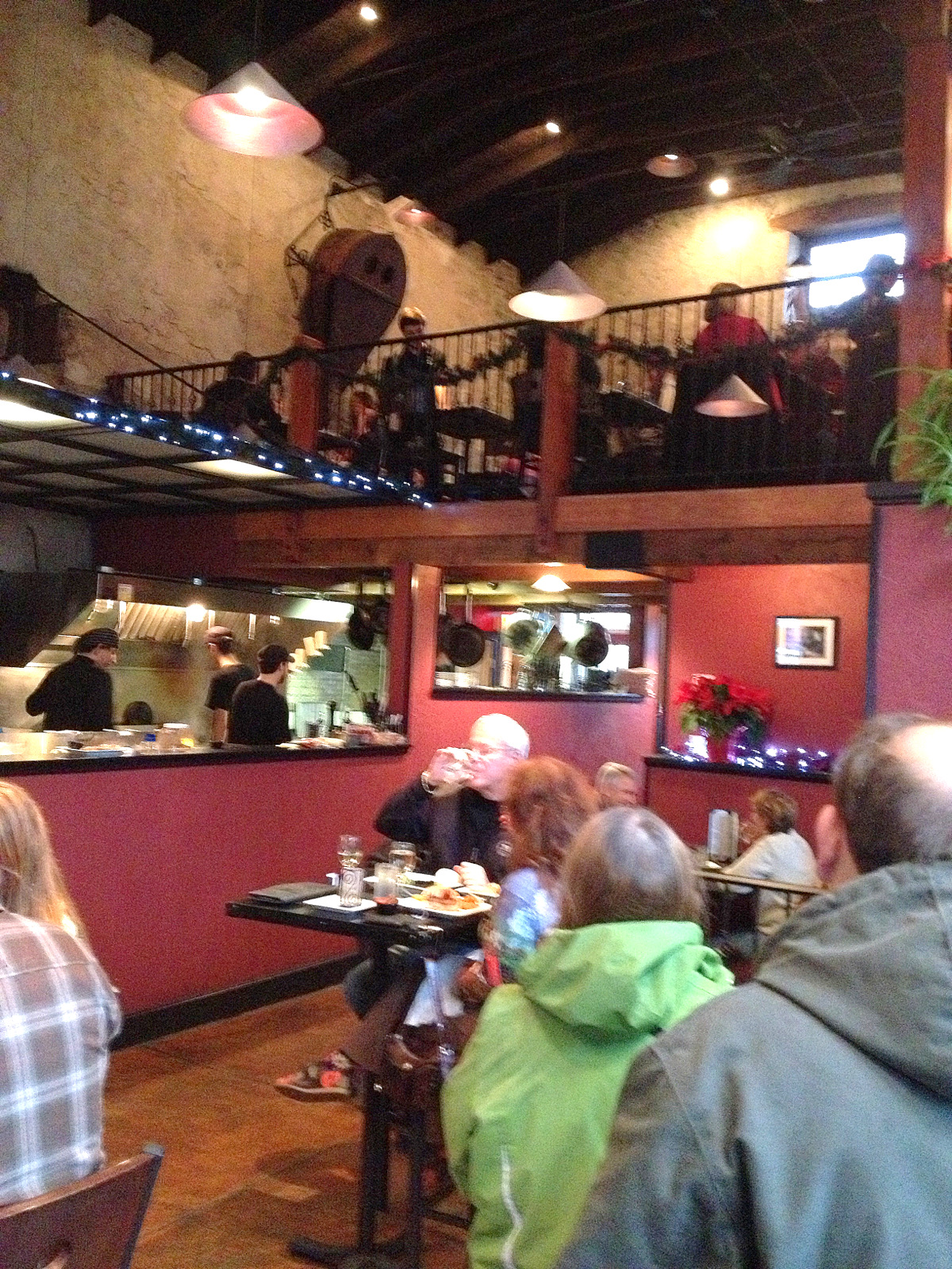 It’s not a large place. The inside has one room with a balcony. All together, there might be 18 tables. Most of them were filled when we walked in. The hostess pointed us to a tall bar table about three feet inside the front door. It didn’t seem like a very relaxing place for a meal. We told her we’d wait for another table. She seemed perturbed and tried again to get us to sit at the table. We resisted. Ten minutes later, we were shown upstairs to the balcony.