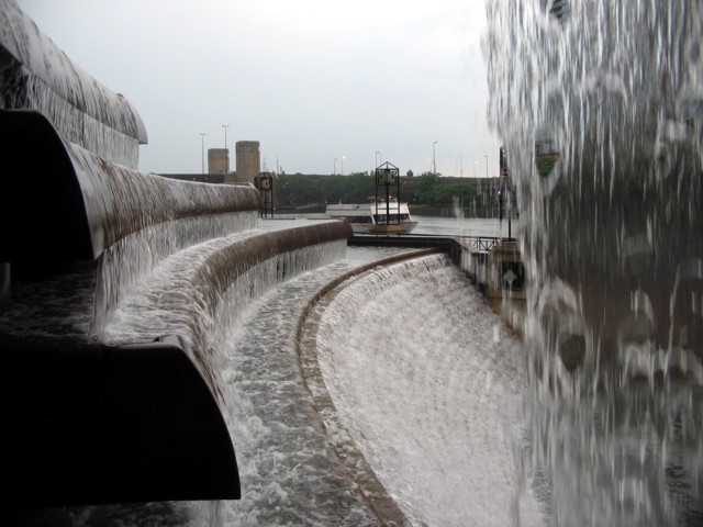We passed this fountain on the Shoreline tour early in the day. I remembered hearing that it occasionally shot an arc of water across the river. I decided to search it out later in the day. My plans were delayed by the rain, but I still went looking and found it on my way back to the station.