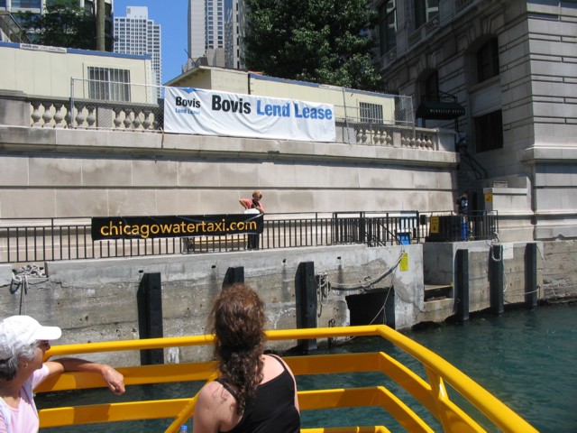 It’s only free for the first two weeks of service, but that’s when we were there. After viewing the Batcolumn, we walked back past the Metra station to the river (which is just half a block east). The Water Taxi was pulling up to the dock as we arrived.