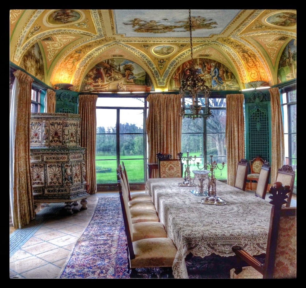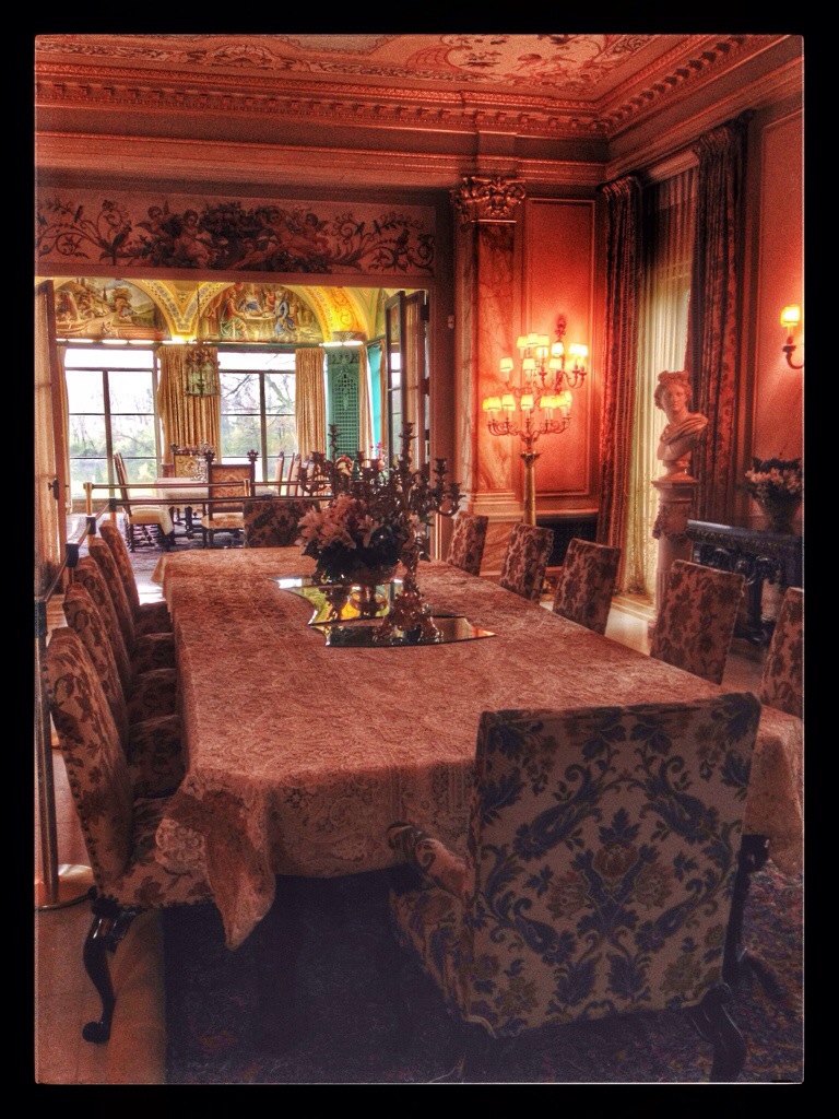 The dining room(s). When all the leaves are in the table, it can seat 75. The Cuneos sat at either end and communicated by phone. The candelabra in the corner is one of four, once owned by Napoleon in his palace in Corsica. All the ceilings are hand painted by John Mallin.