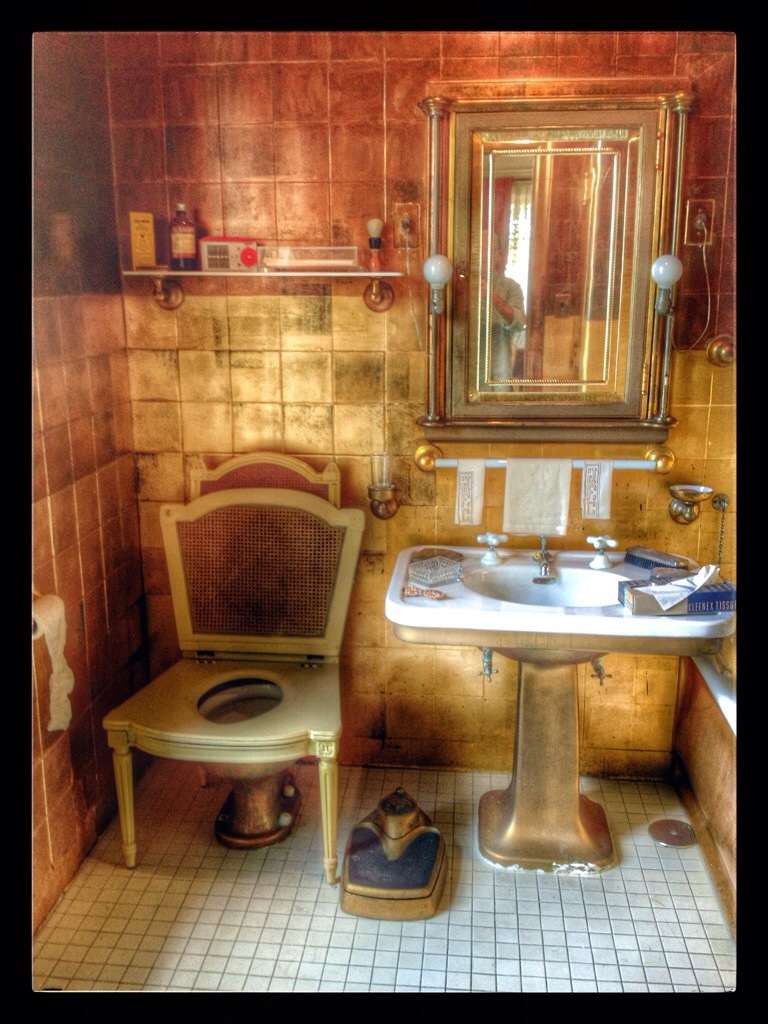 The ladies’ powder room. The “facilities” are in a smaller room to the right where the walls are decorated with gold leaf (which also backs the mirrors).