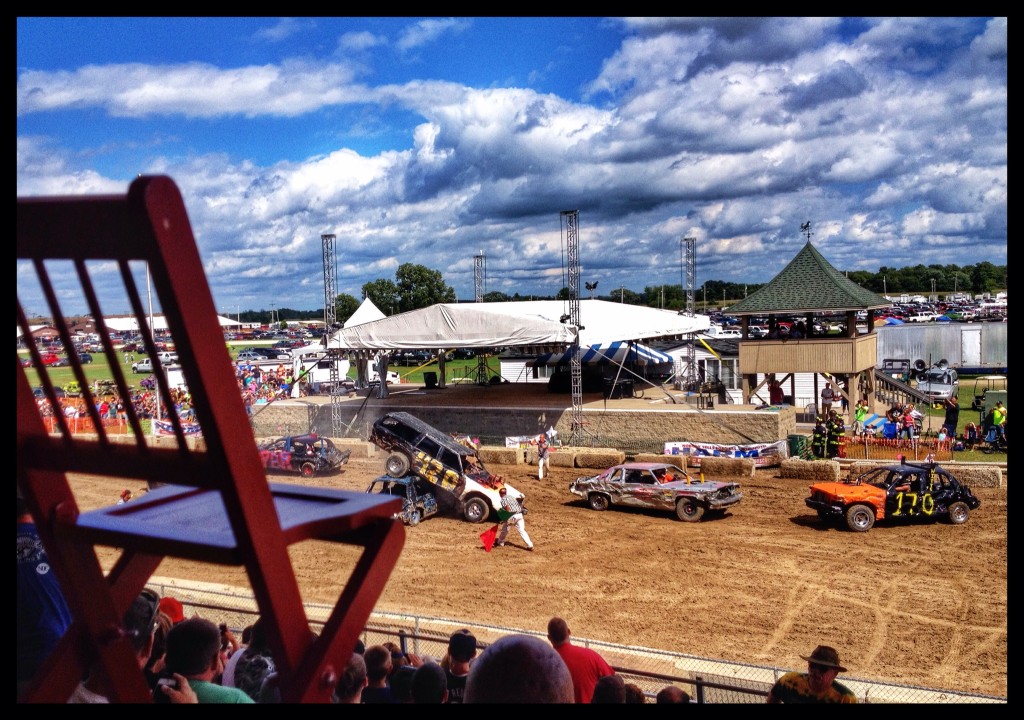 We found seats in the grandstand on the fairgrounds to watch the demolition derby.