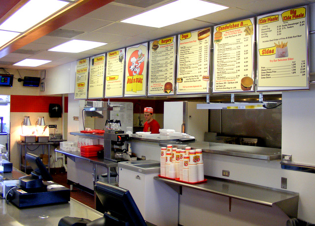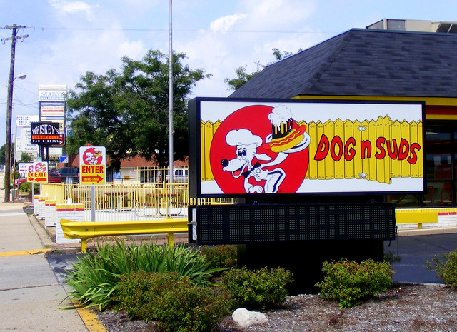 A brand new Dog n Suds opened in Rockford this spring. It’s located in an old McDonald’s. It’s a dine-in restaurant with a drive-through window — no car hop service. The reviews on the Internet were all rather negative. I suspect it won’t be around long, so I thought I’d better visit while I can.