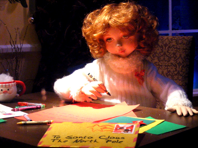Here’s the first window at Macy’s. The letter this girl is writing says, “Dear Santa, I promise I’ve been good. Please bring me …” We guessed she was going to ask for a longer crayon or a taller desk.