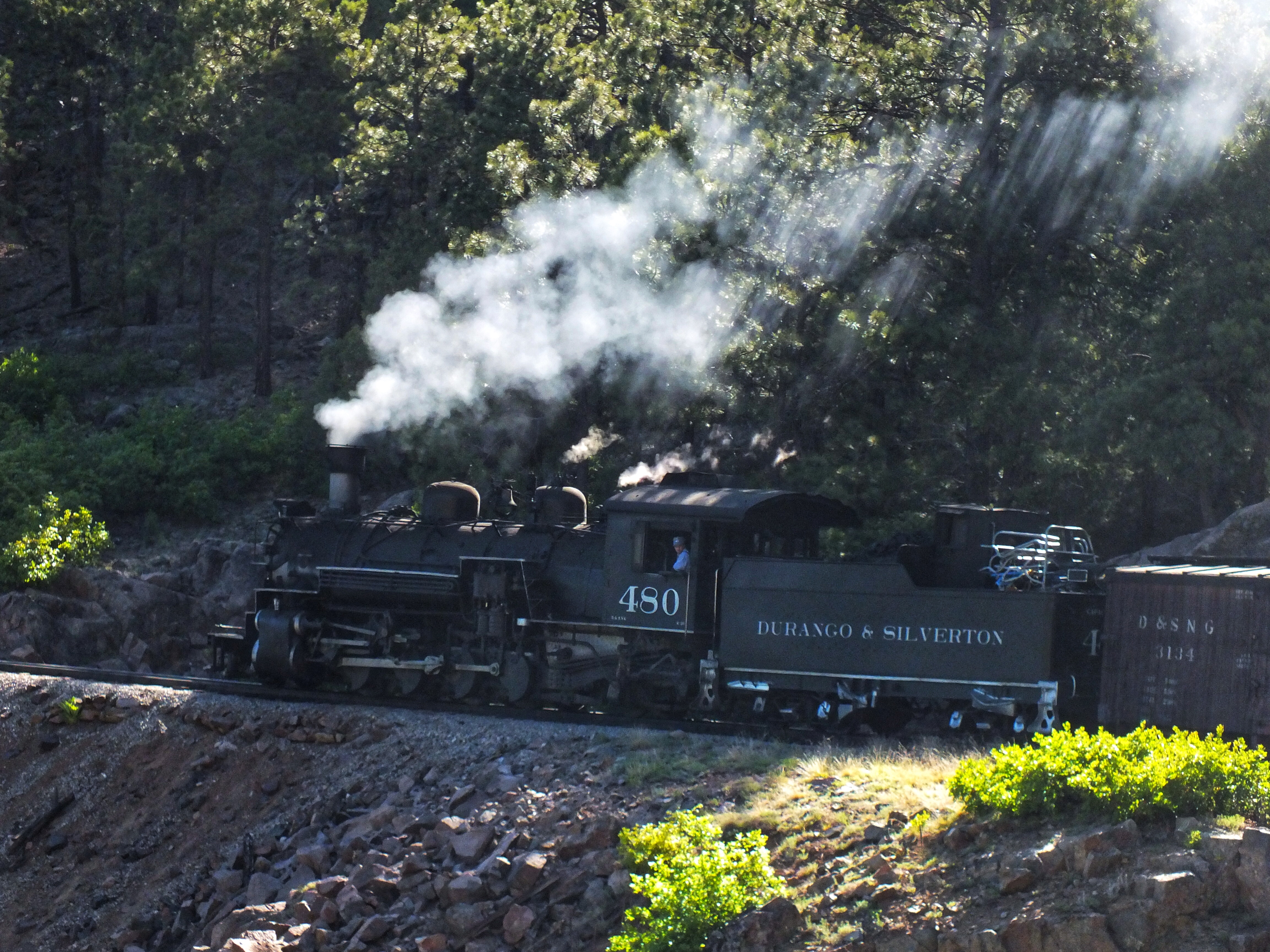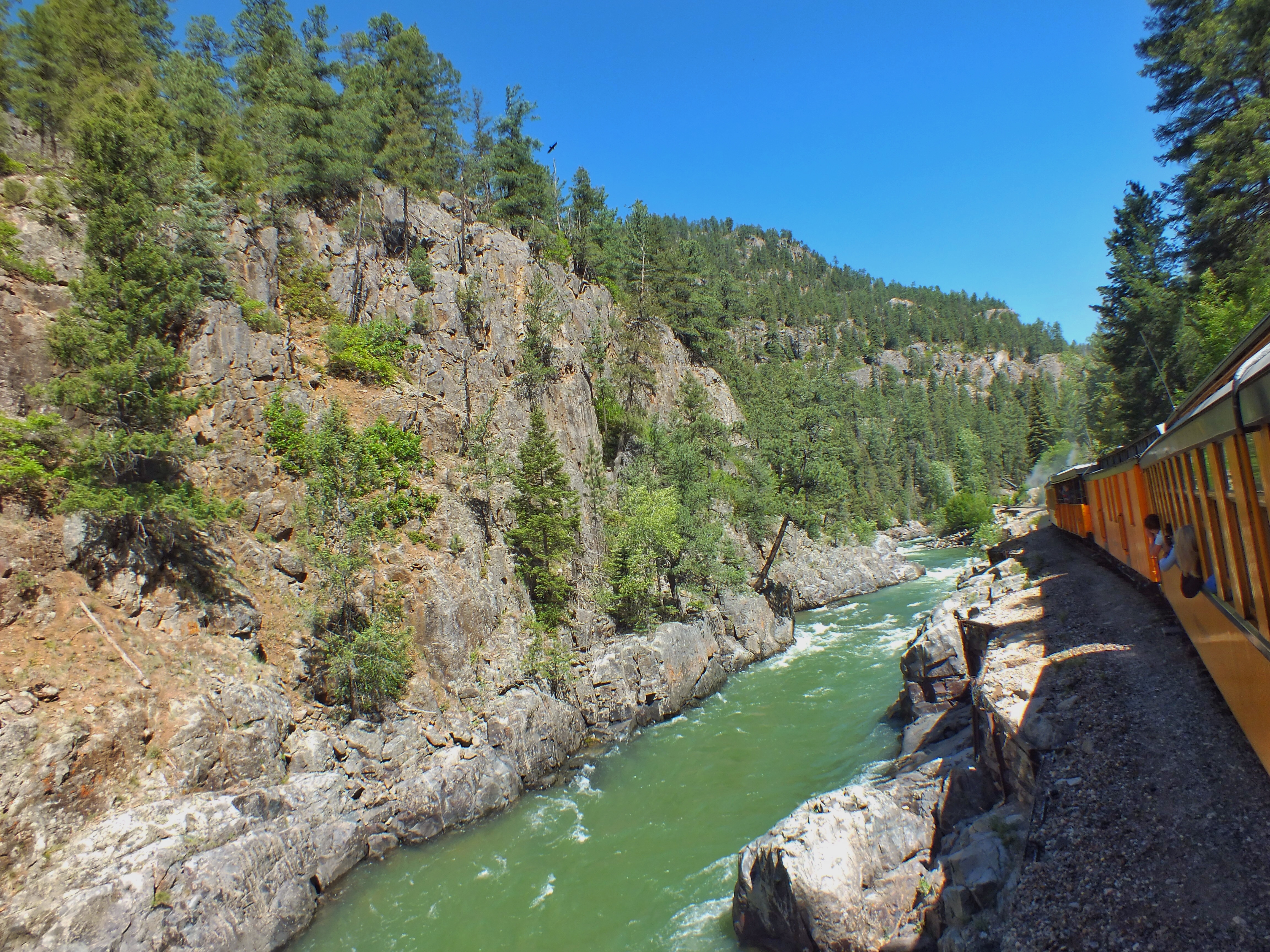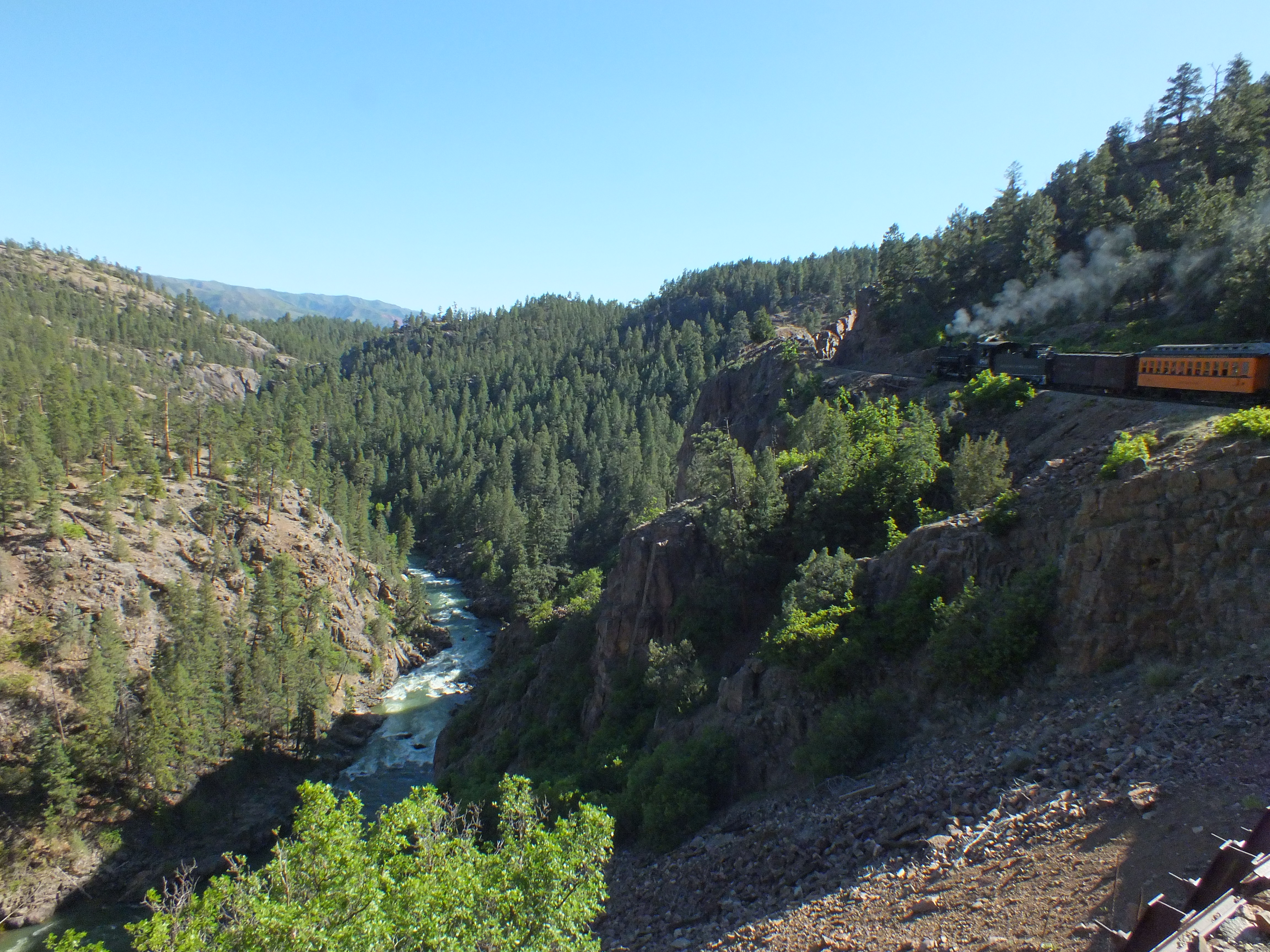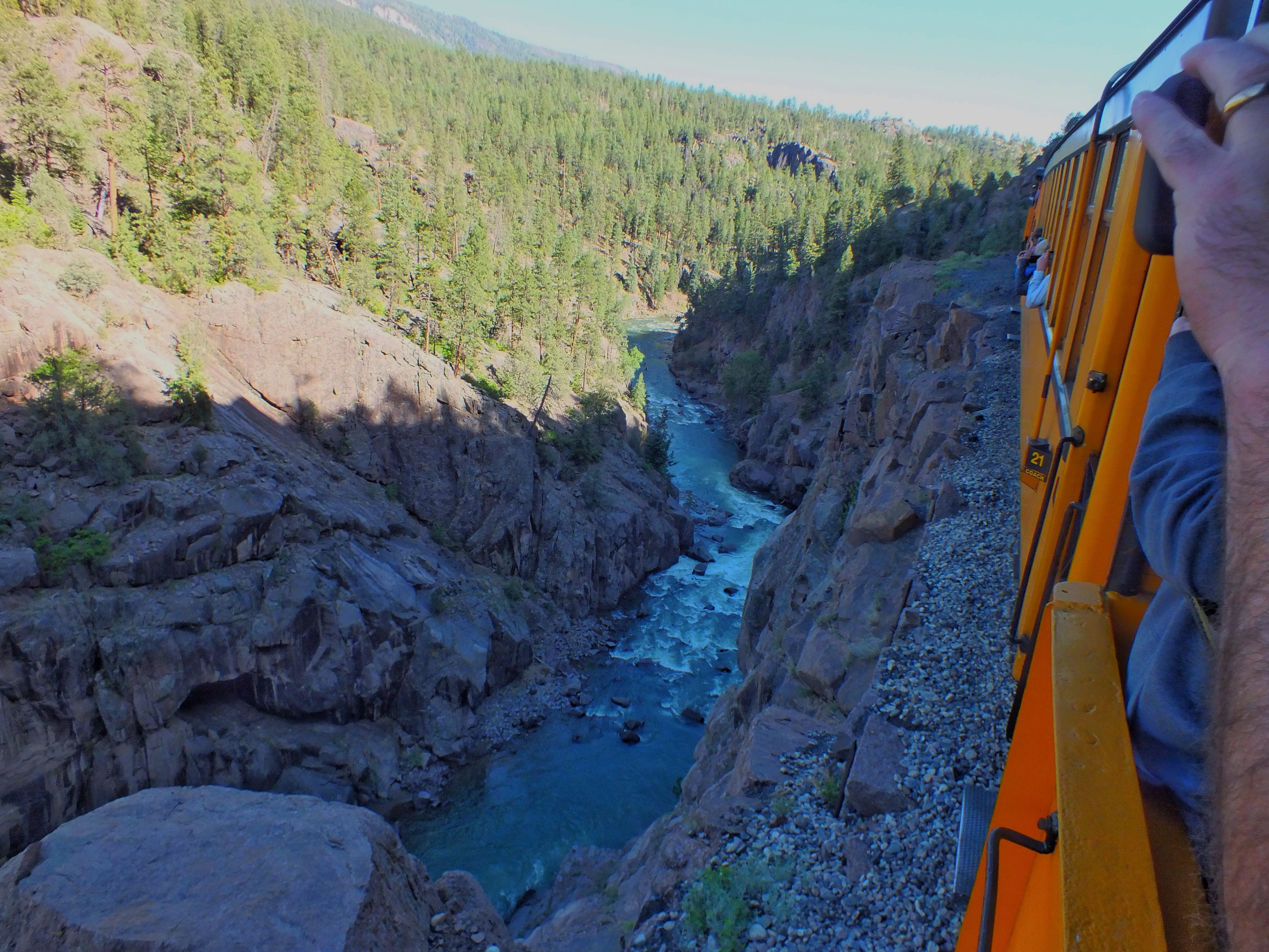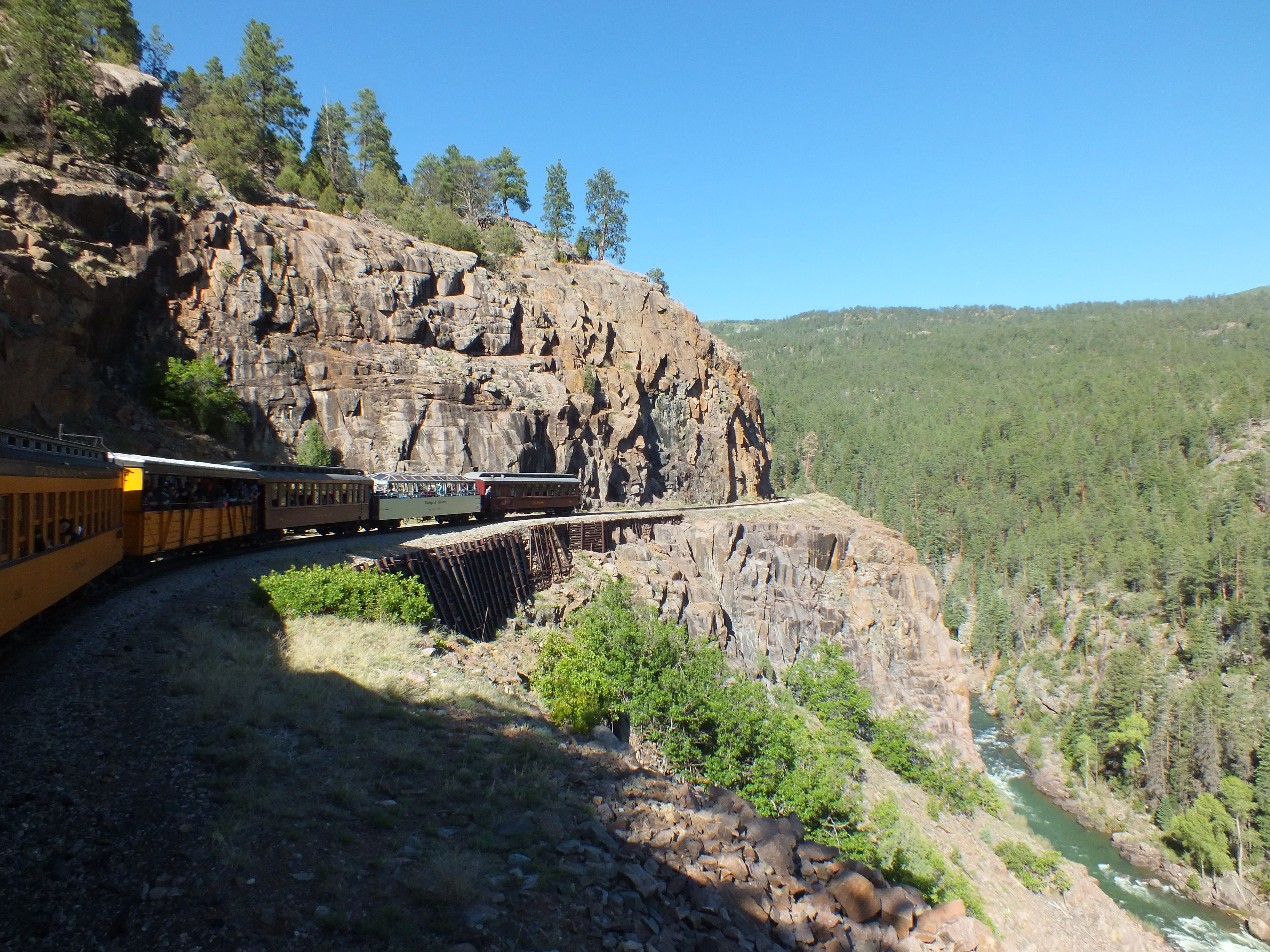 On the afternoon trip, we got a great view of one of the most famous stretches of track in the world. The train runs on a narrow ledge 400 feet above the Animas. The afternoon light and shadows were awful for taking photos.