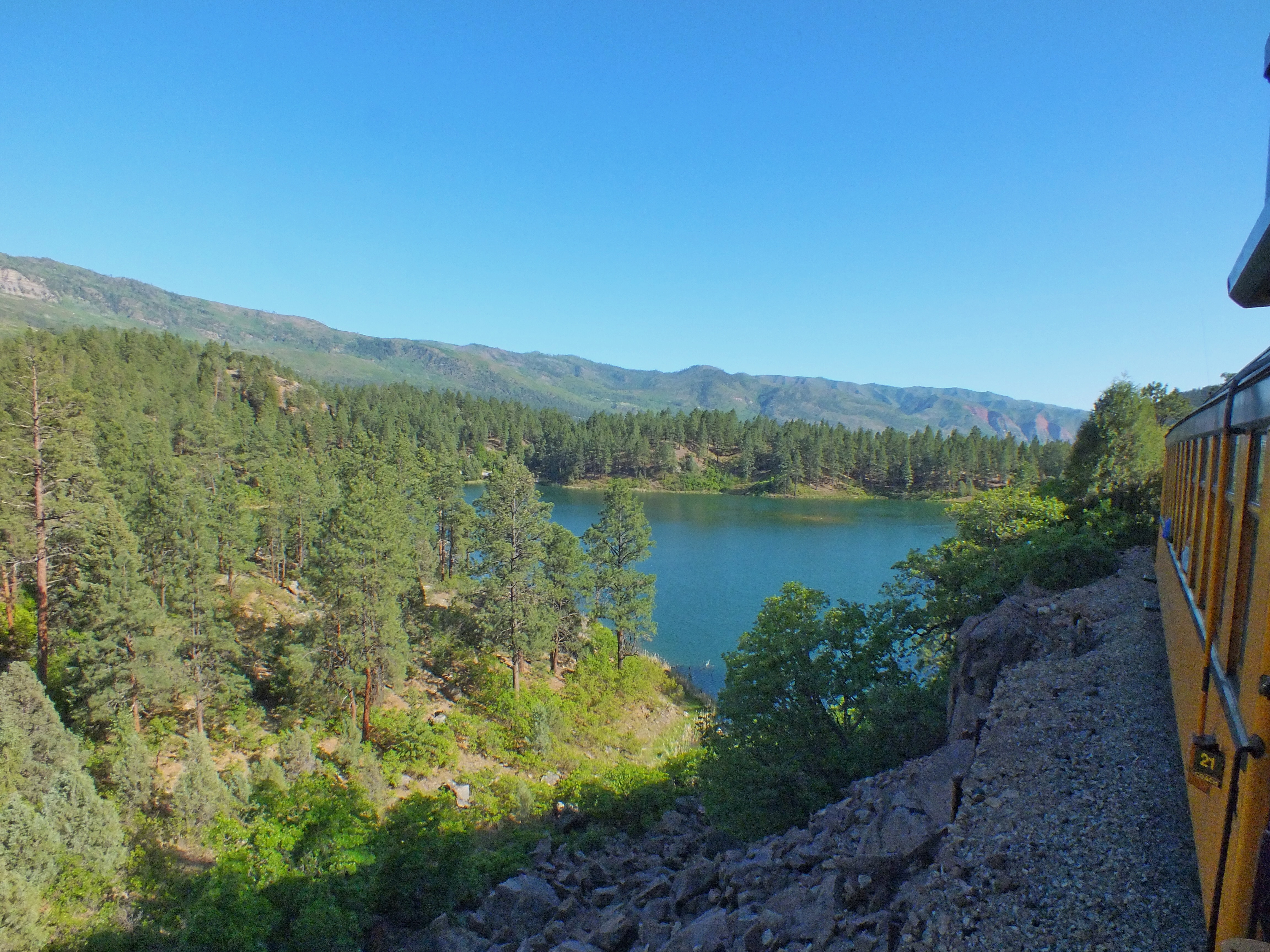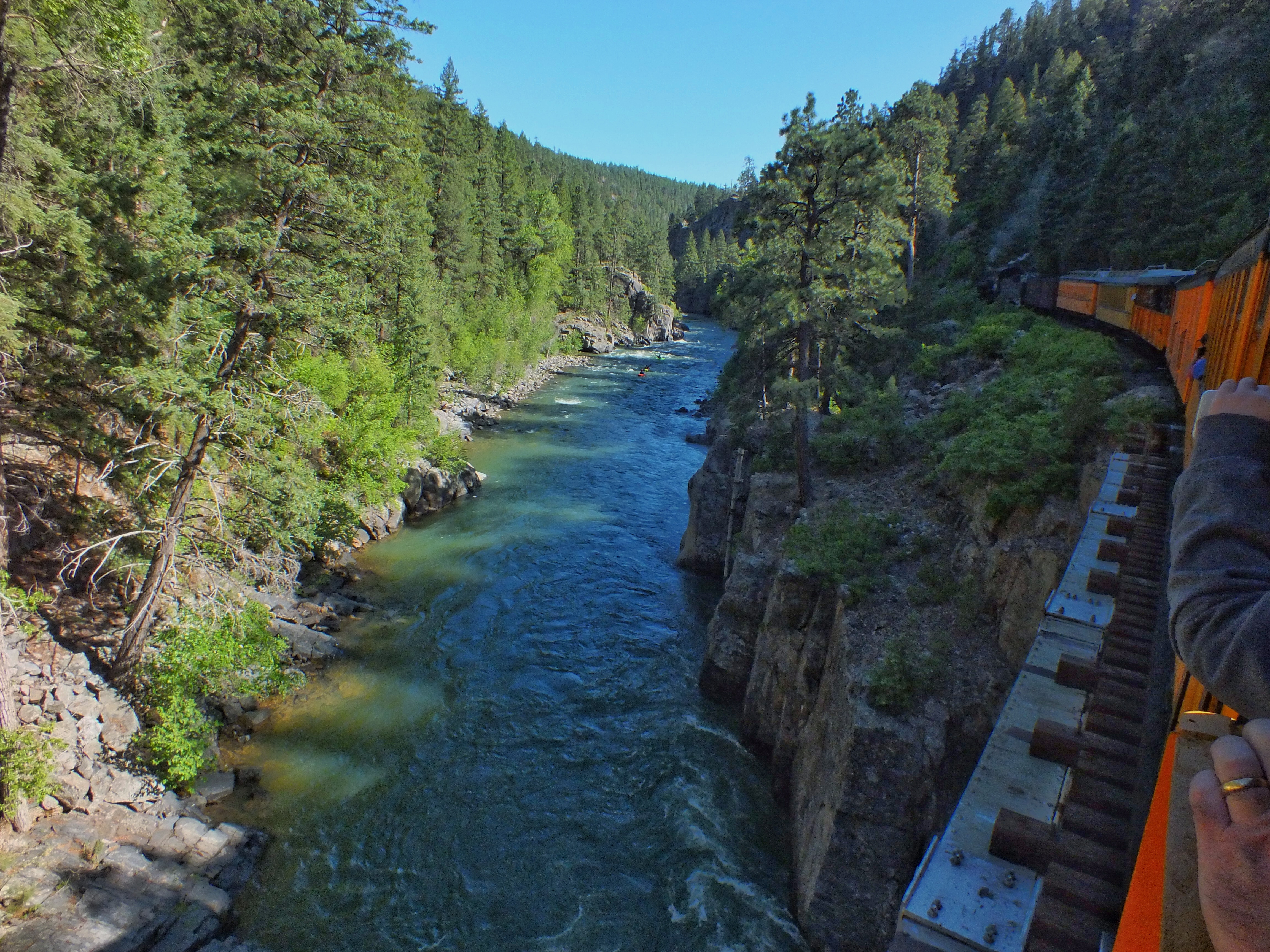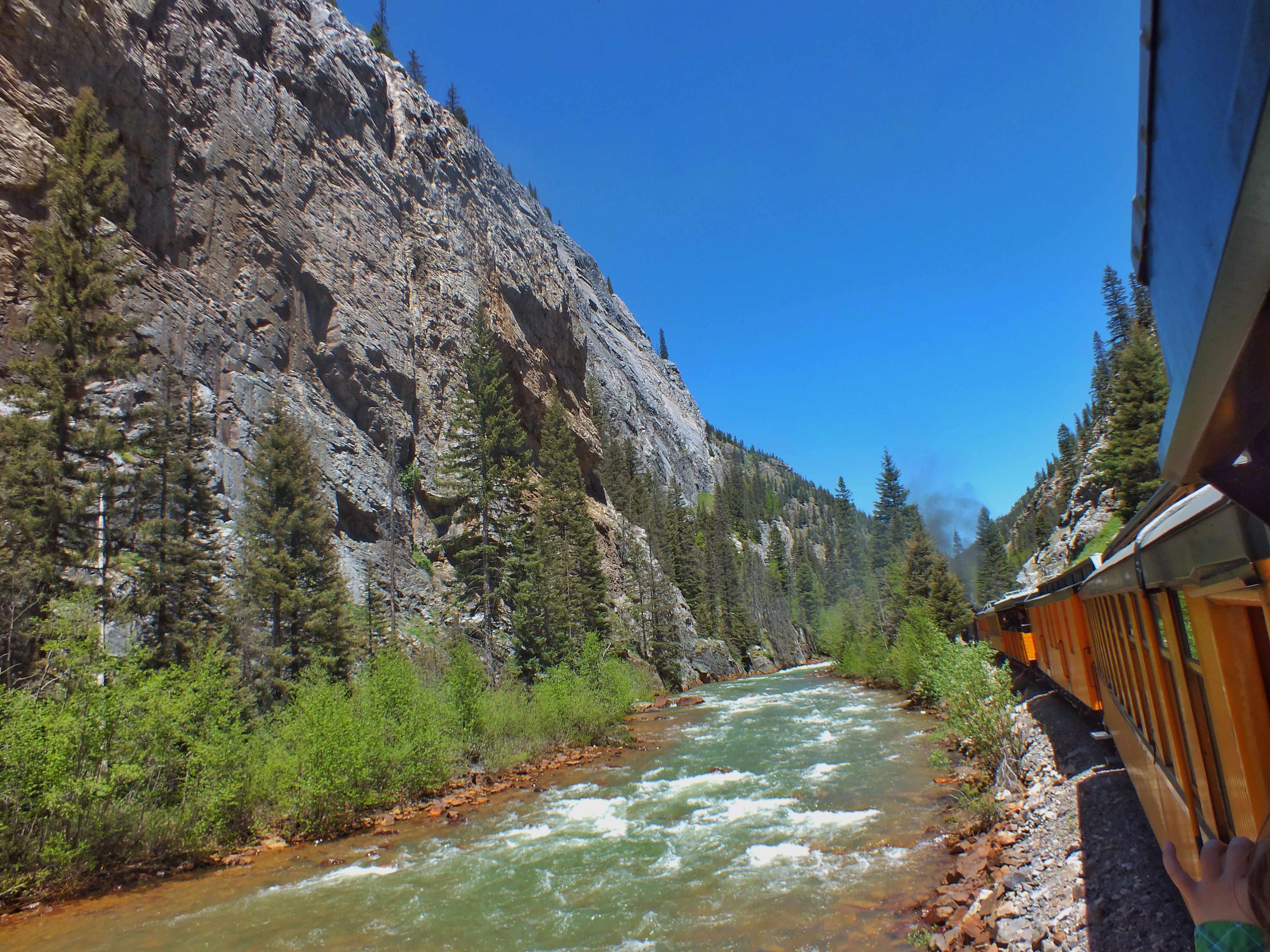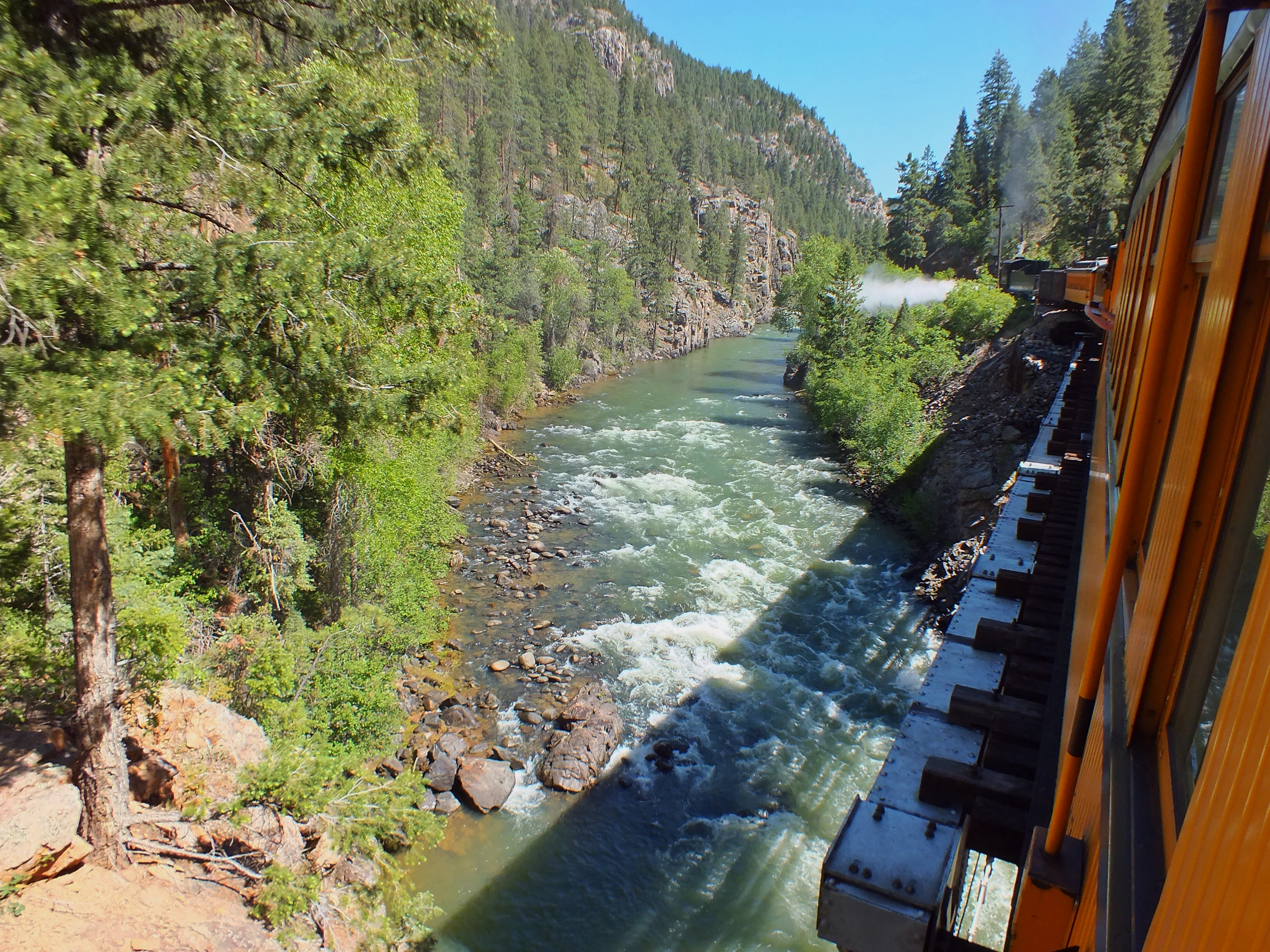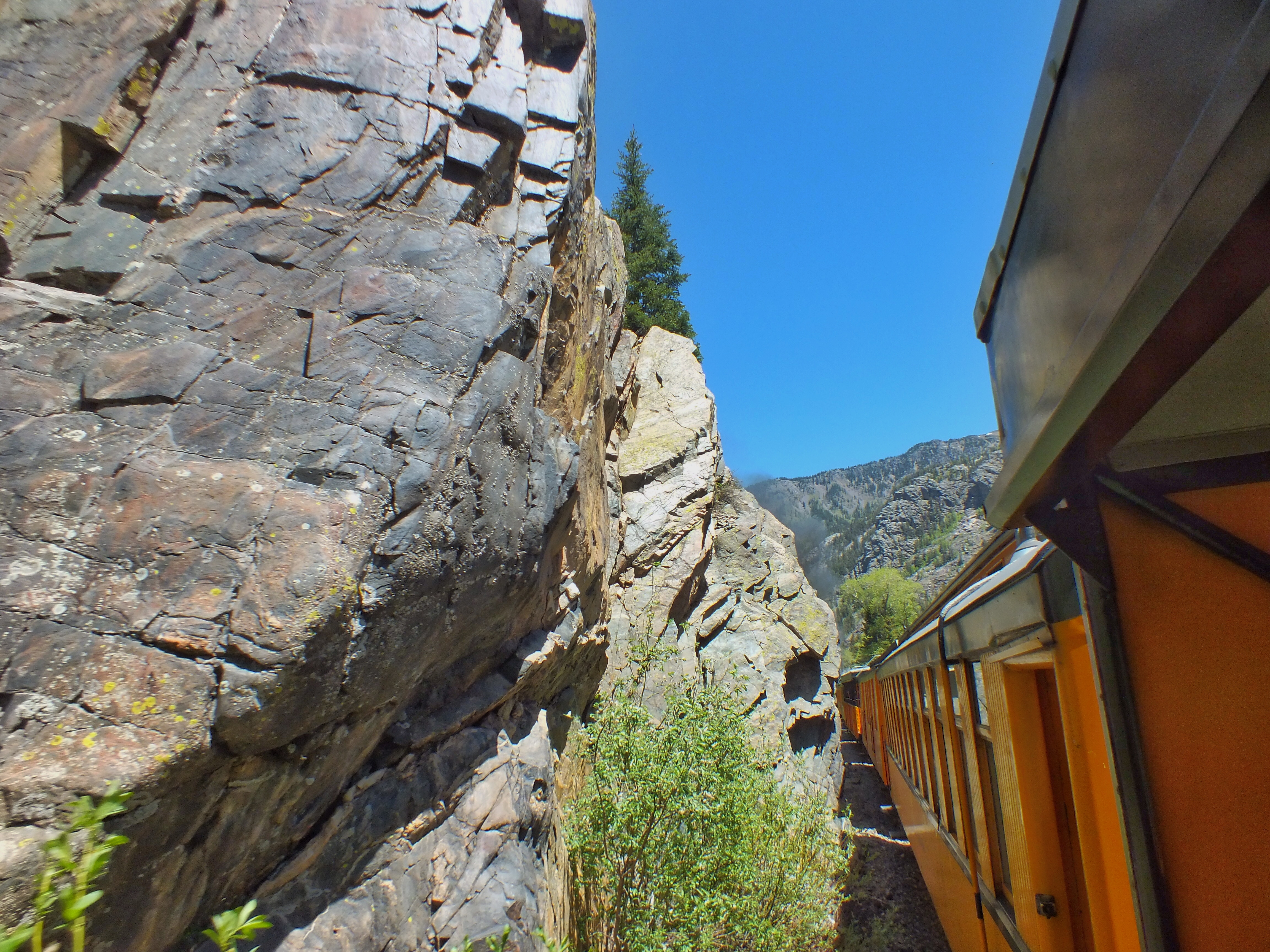 On the afternoon trip, we got a great view of one of the most famous stretches of track in the world. The train runs on a narrow ledge 400 feet above the Animas. The afternoon light and shadows were awful for taking photos.