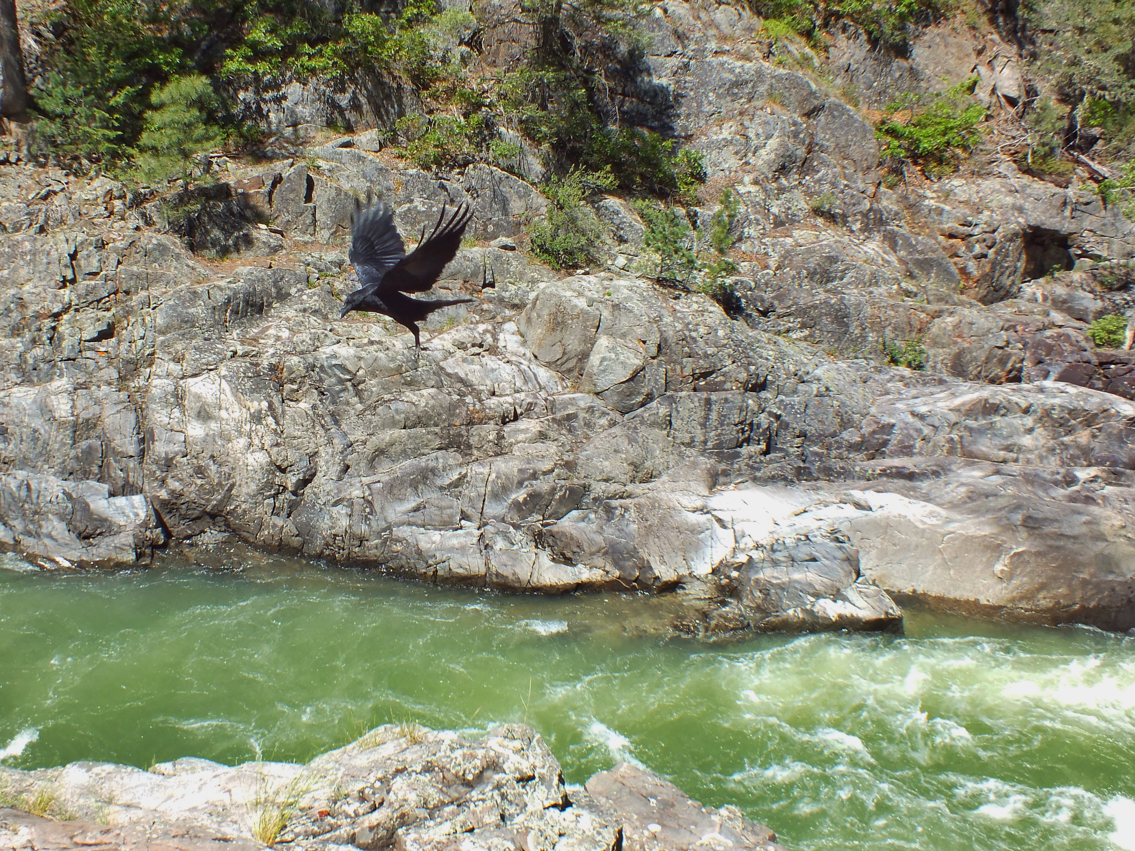 At one of the stops for water, two ravens flew down into a tree across the river from our car. I knew they were looking for food, so I gave them some. I tossed a couple cookies onto a rock. Both of the birds flew down to grab them but chickened out at the last minute because they were so close to the car. I looked back after we got moving again and saw them fly down and grab them.