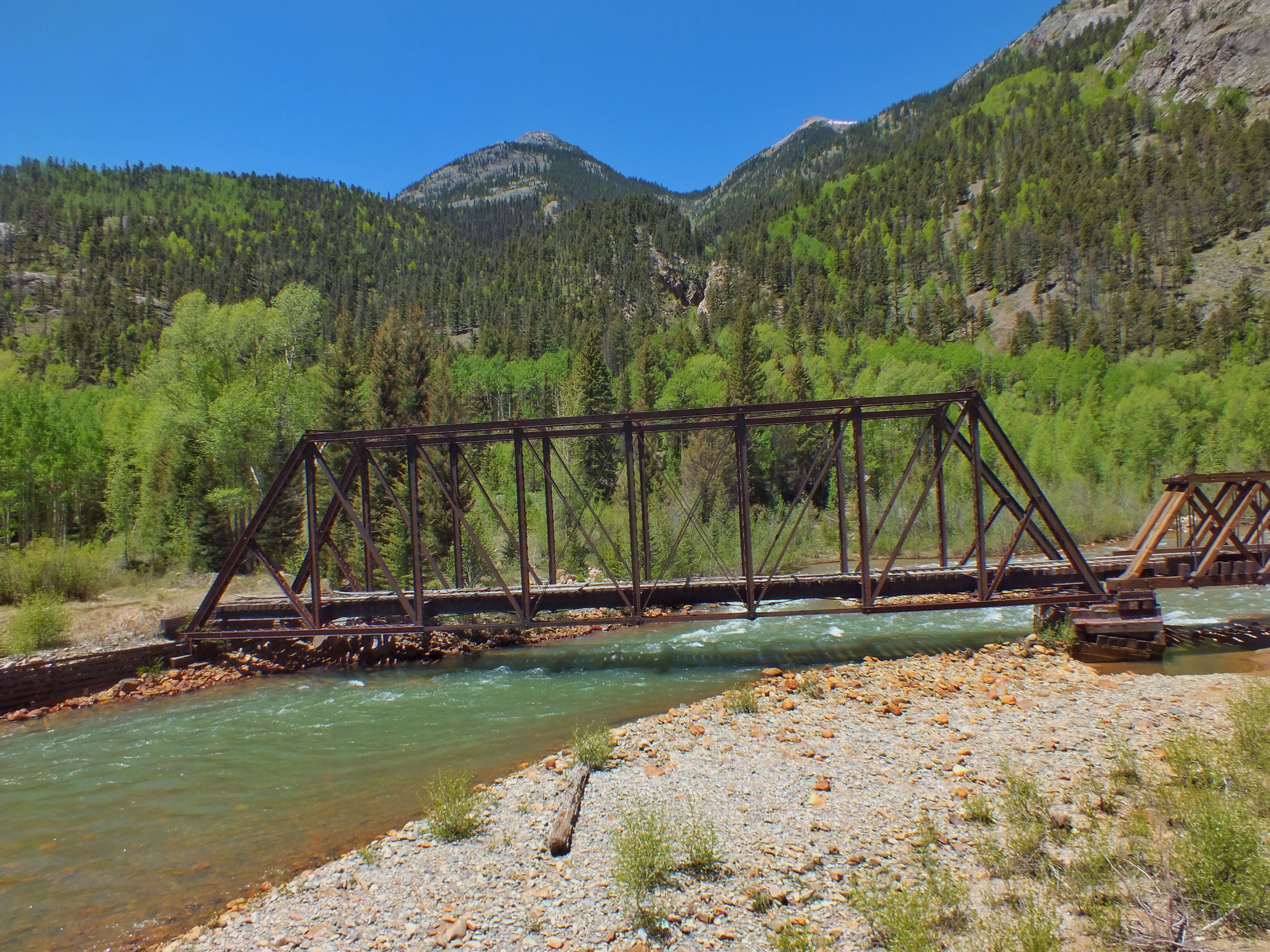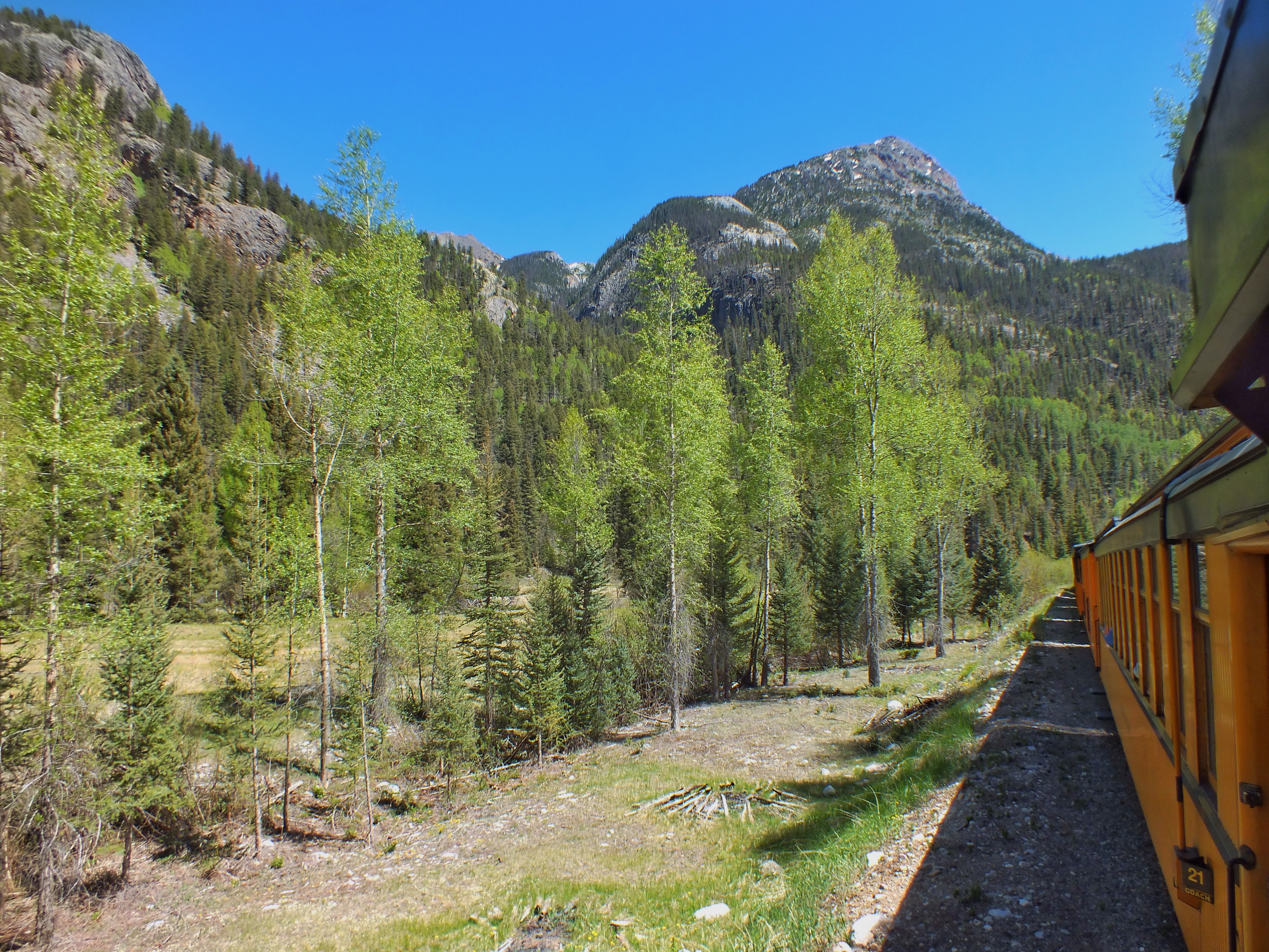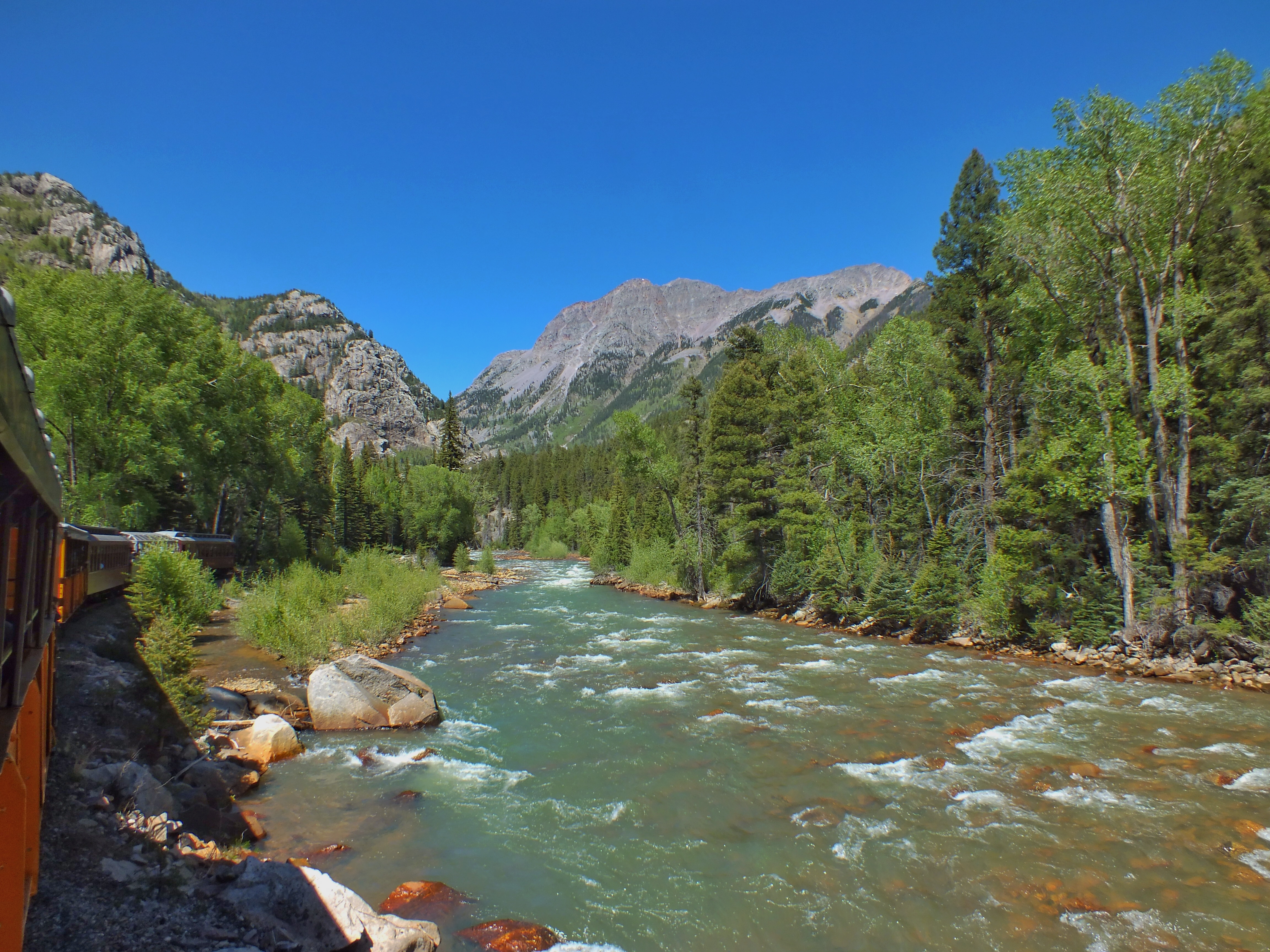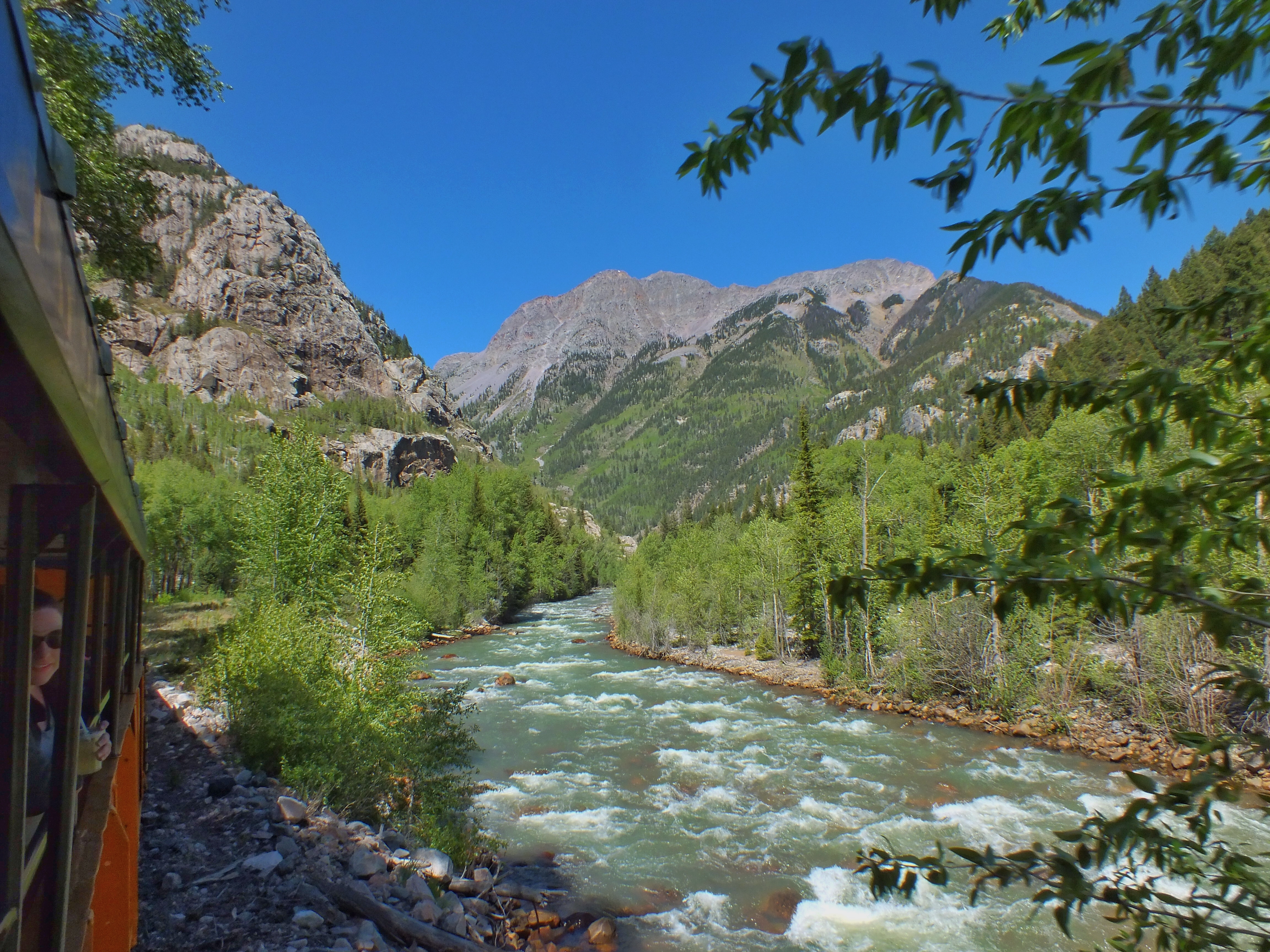 The tracks ran along the Animas River. Those on the river side of the train had excellent views of the water. Those on the other side saw mostly hillside — sometimes only inches from the side of the car. Fortunately, the tracks crossed the river four times, so both sides had good views part of the time — and remember that we were on the other side for half the ride so we got to see all the views.