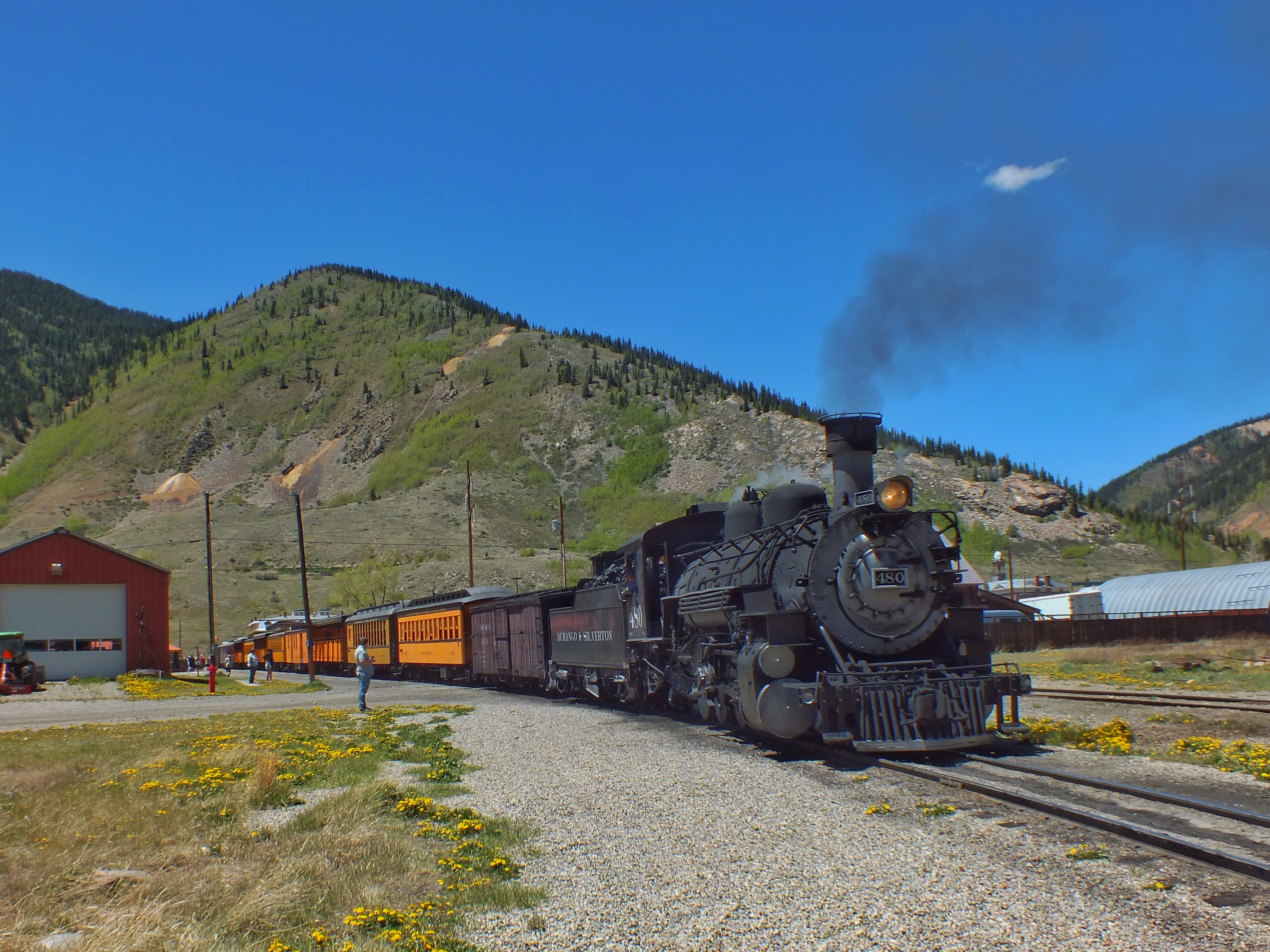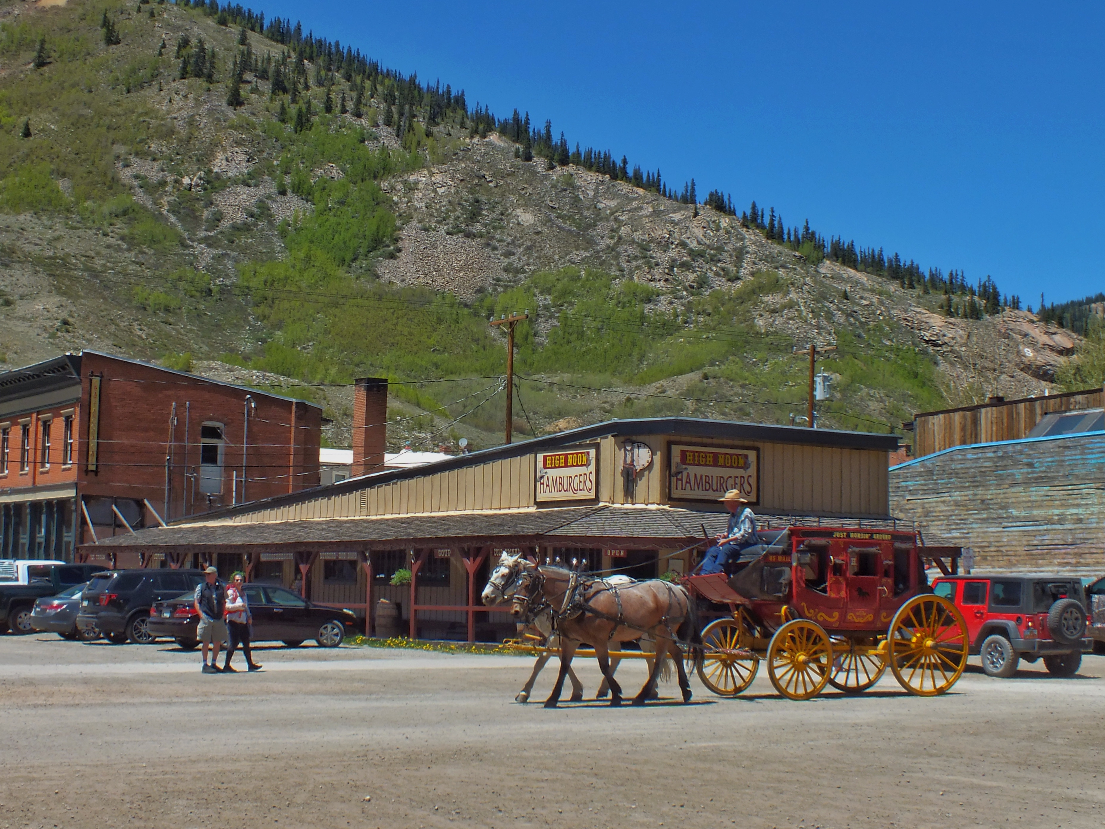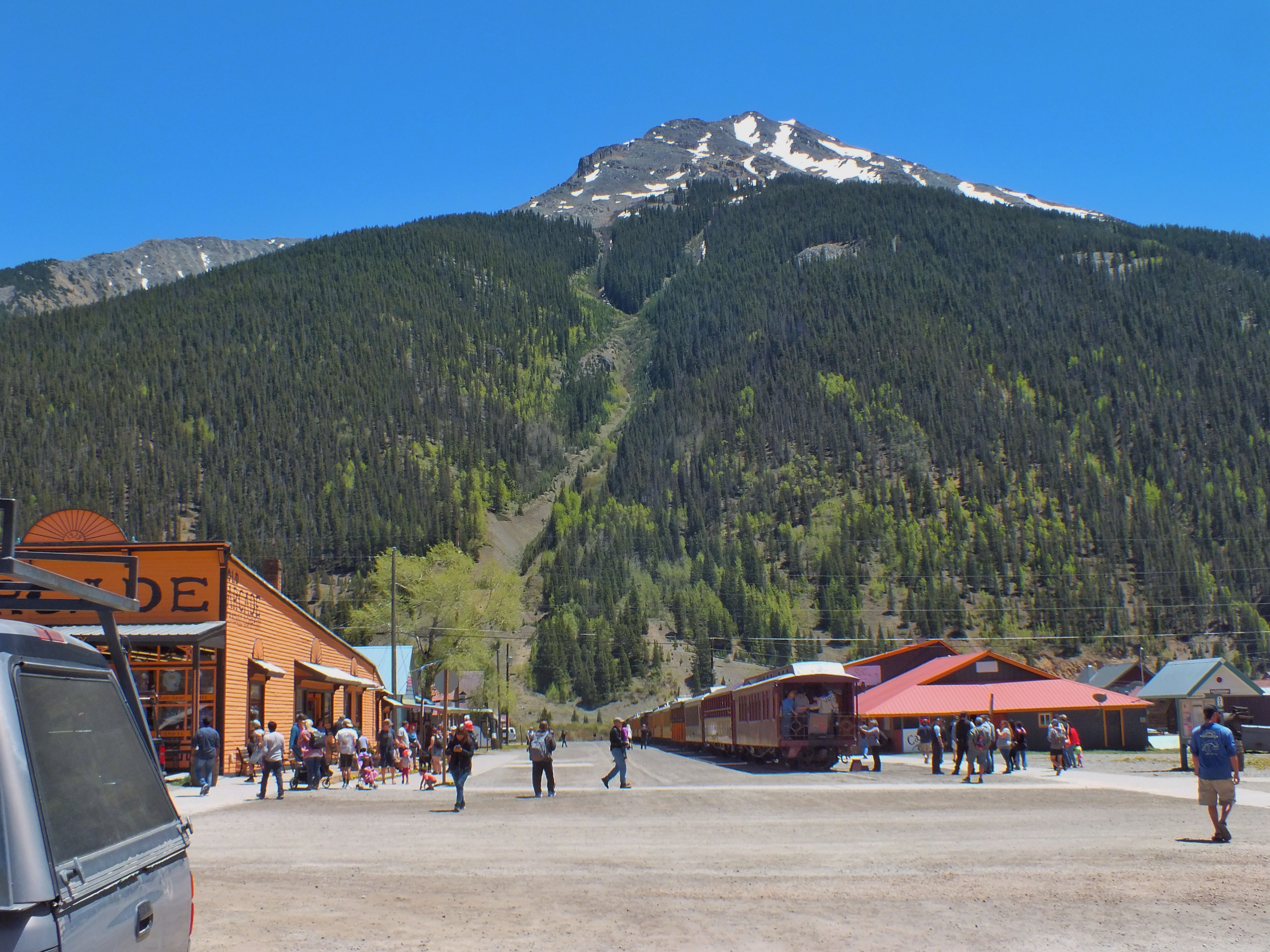 Friends were in town for Memorial Day Weekend, so we decided to do something fun. We headed to Durango and rode the old narrow-gauge train from there to Silverton and back. We were supposed to leave Durango Sunday morning at 8:45 am, but the train was delayed by half an hour so they could get the right cars in the right order. The ride took four hours one-way — half an hour longer than usual — because there was a “slow order” in place. This wasn’t explained, but I suspect it was so the train didn’t cause sparks that start fires. All this meant that our scheduled layover in Silverton was reduced to little more than an hour, but that was long enough for us to grab a quick (and surprisingly-tasty burger) and wander about town.