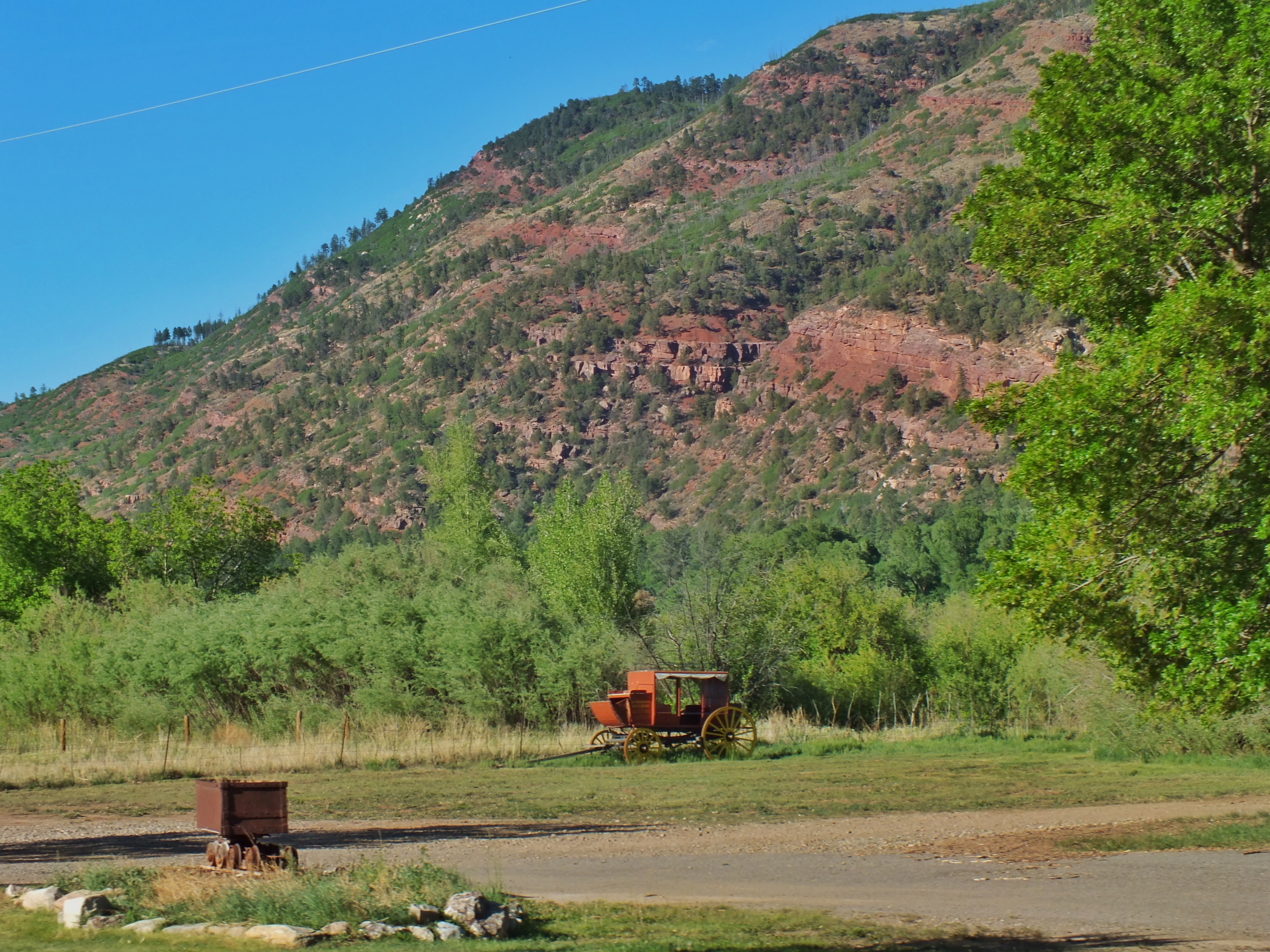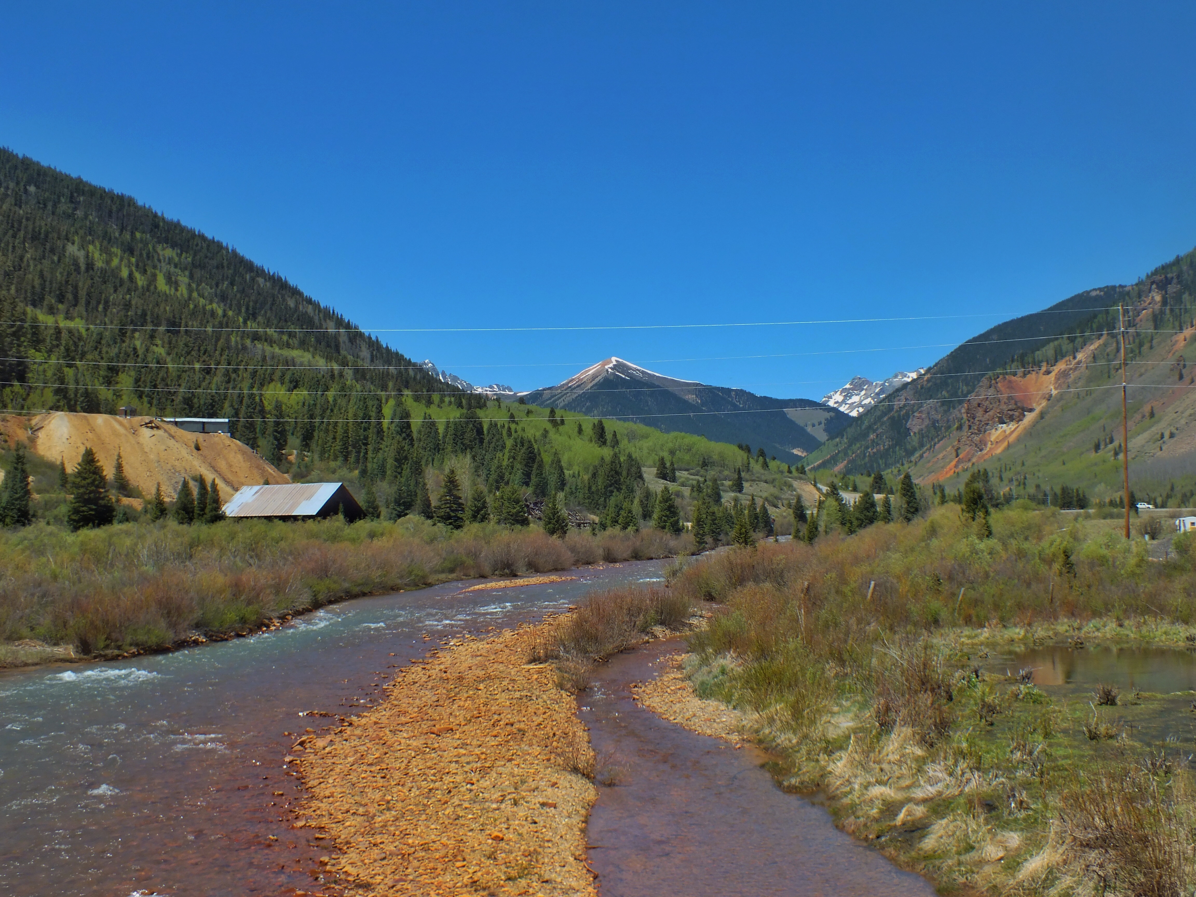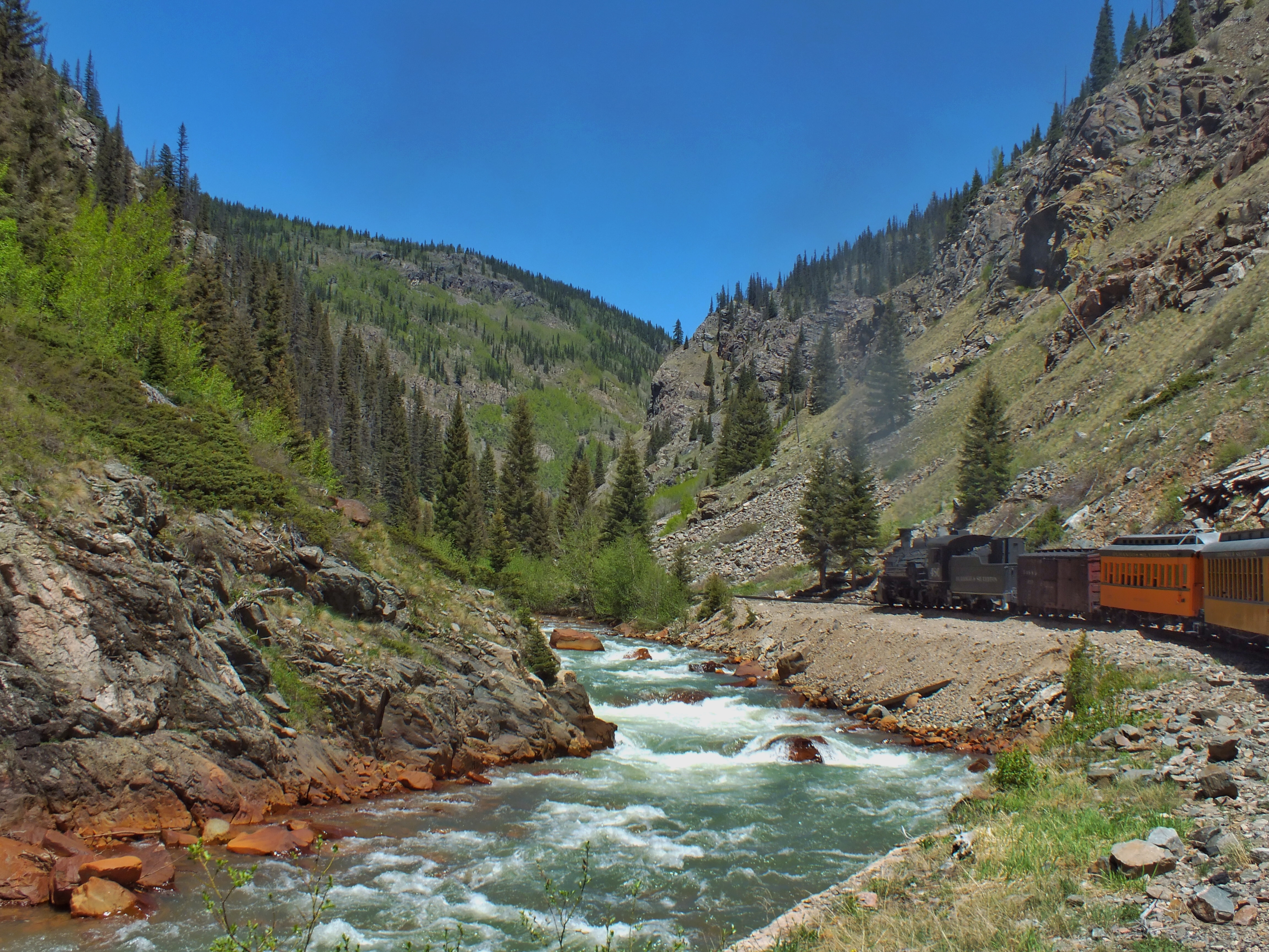 Friends were in town for Memorial Day Weekend, so we decided to do something fun. We headed to Durango and rode the old narrow-gauge train from there to Silverton and back. We were supposed to leave Durango Sunday morning at 8:45 am, but the train was delayed by half an hour so they could get the right cars in the right order. The ride took four hours one-way — half an hour longer than usual — because there was a “slow order” in place. This wasn’t explained, but I suspect it was so the train didn’t cause sparks that start fires. All this meant that our scheduled layover in Silverton was reduced to little more than an hour, but that was long enough for us to grab a quick (and surprisingly-tasty burger) and wander about town.