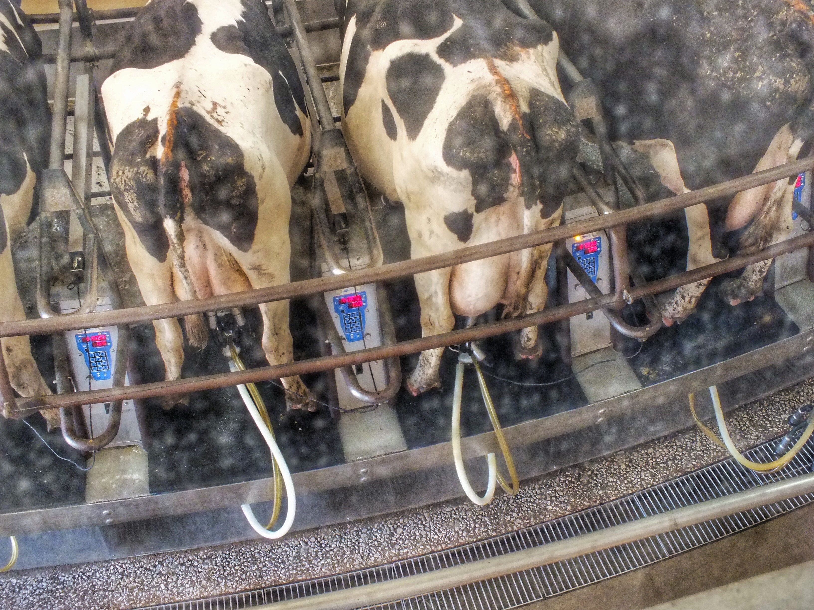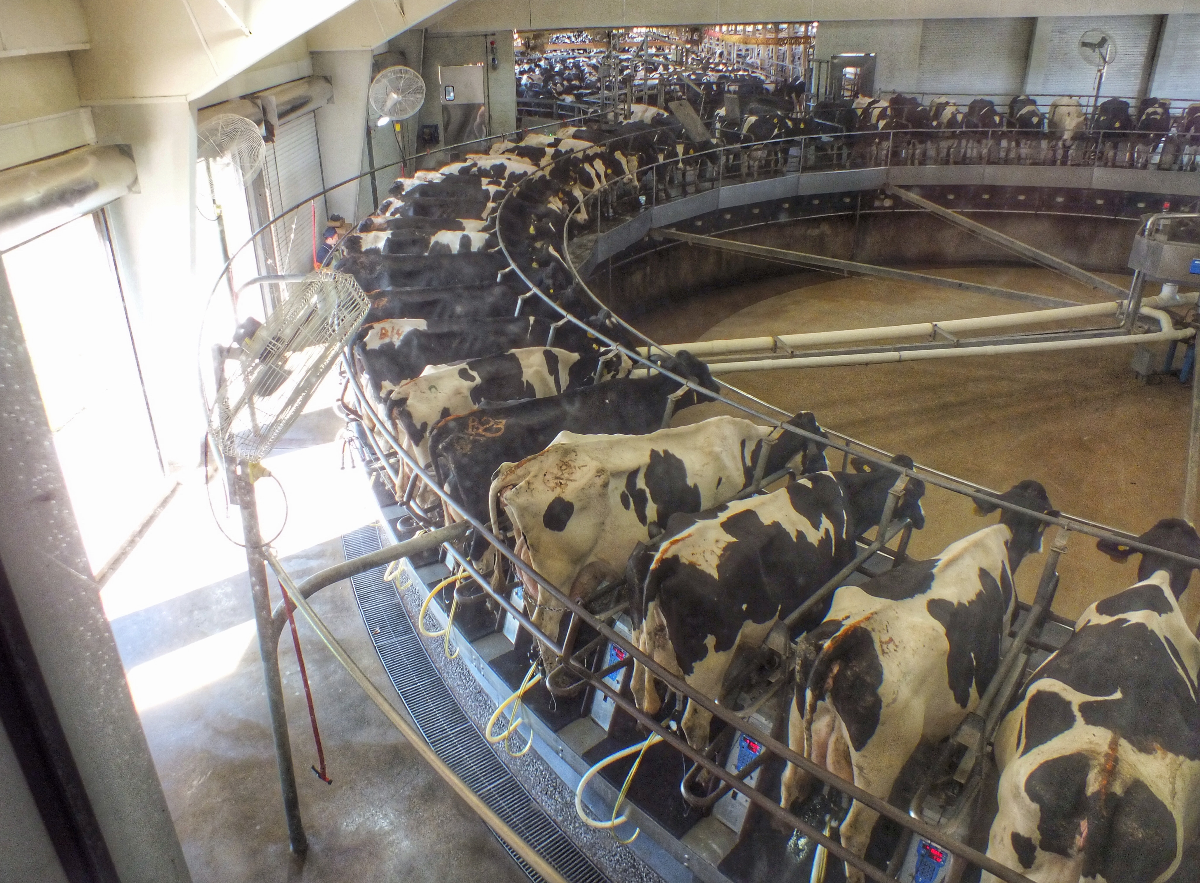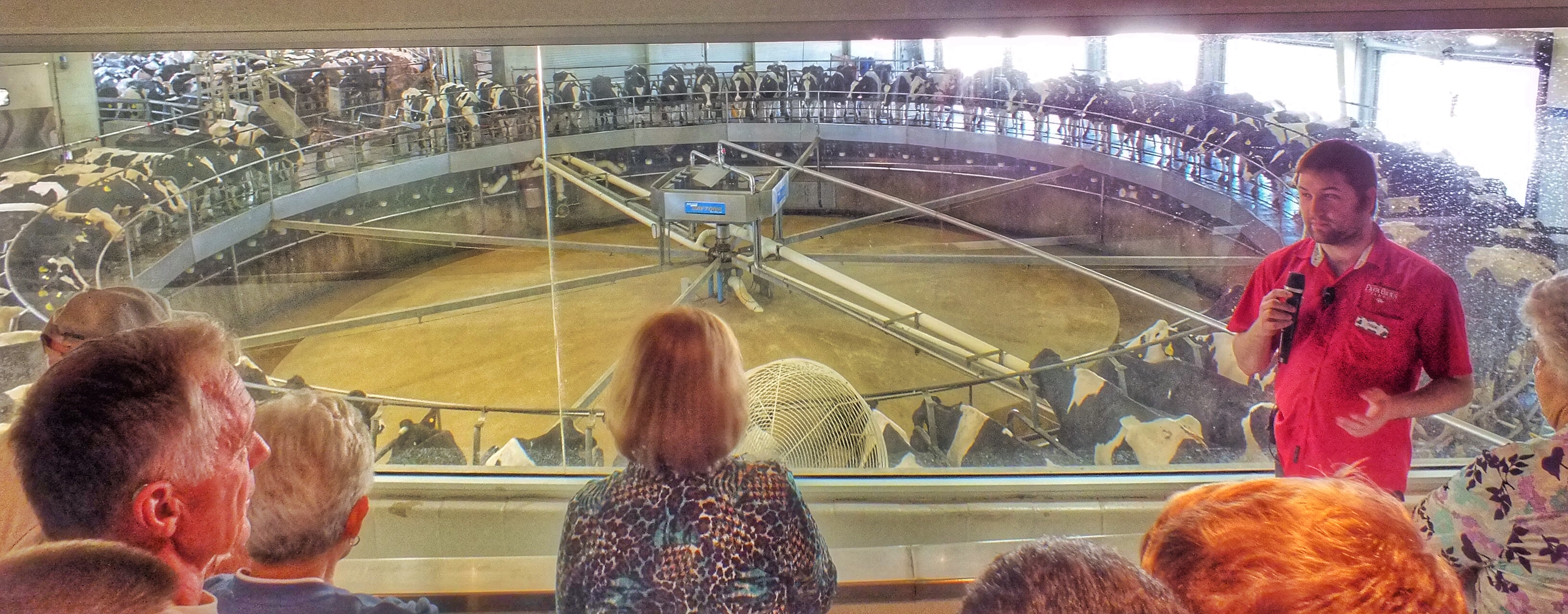 We stood on a sloped walkway and looked through a window at a bunch of cows being milked on a turntable.