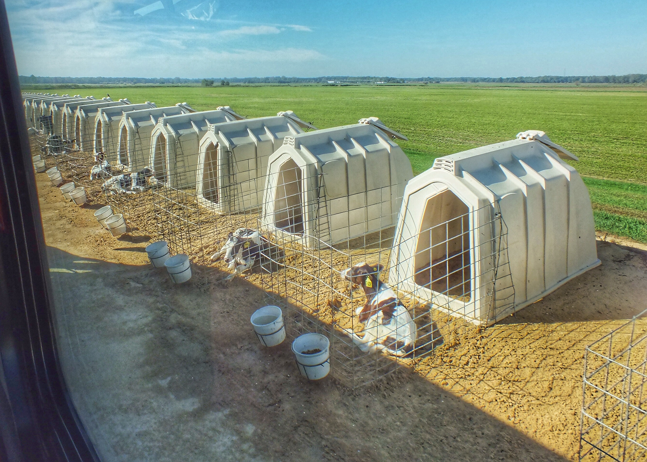 We drove past a row of calves in small cages — I forget why.