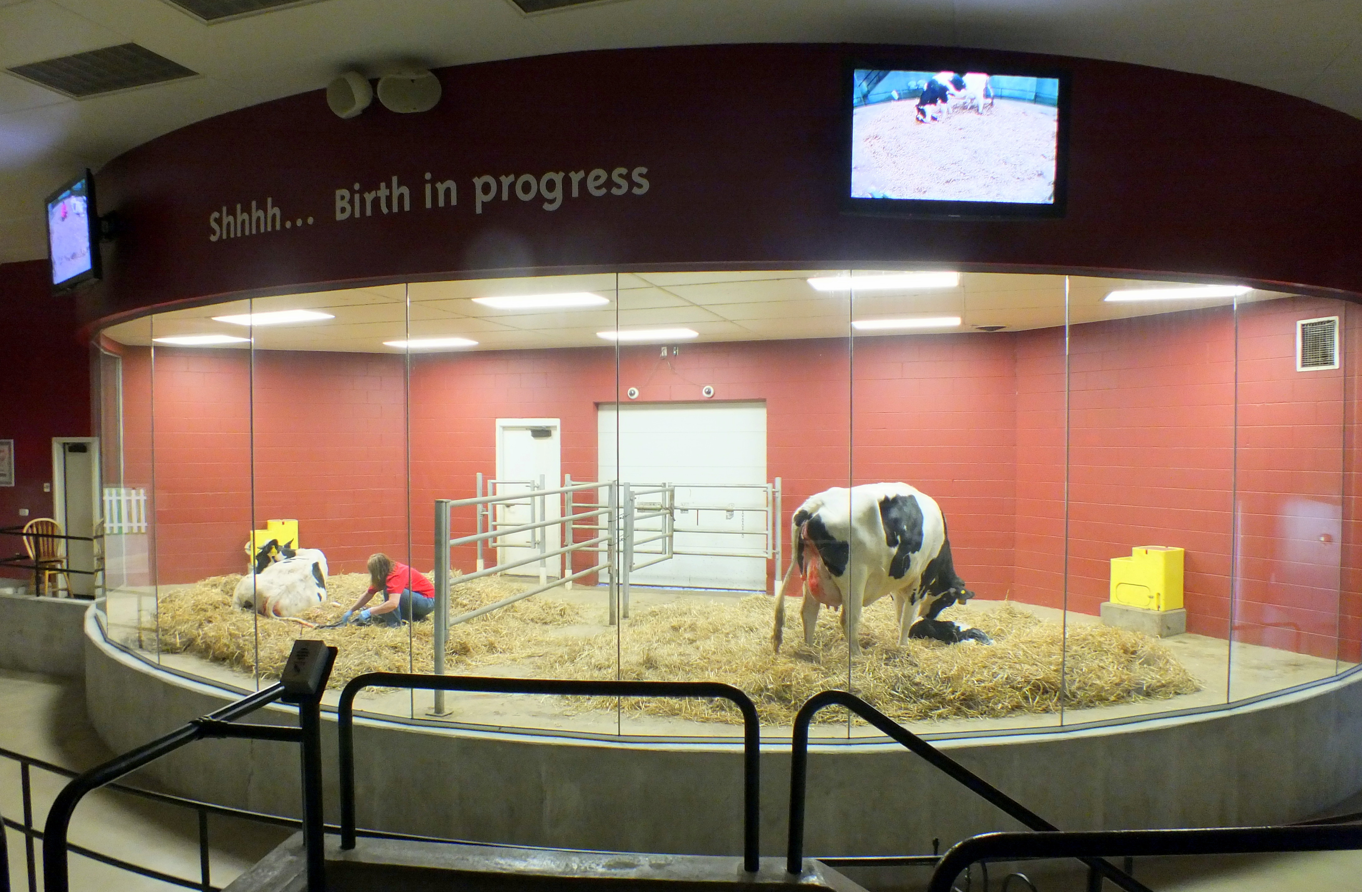 The light on the birthing barn was green, which mean a calf was being born. We rushed over and sat in the bleachers to see this.