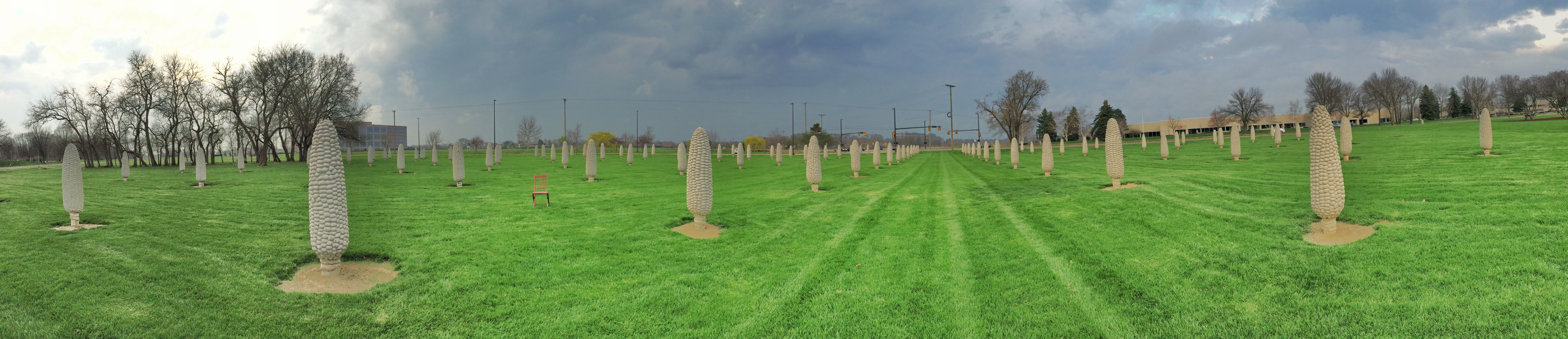 Frantz Park in Dublin, Ohio, is a large lawn in front of a corporate headquarters filled with concrete ears of corn. It supposedly “symbolizes the history of the community’s farming legacy and serves as a memorial to rural landscapes.”