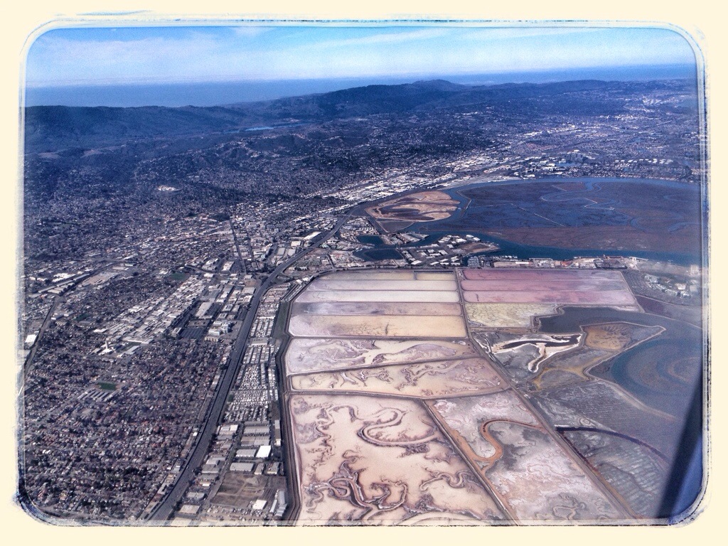 Crossing the eastern shore of San Francisco Bay over San Leandro. Oakland International Airport is in the lower right corner.