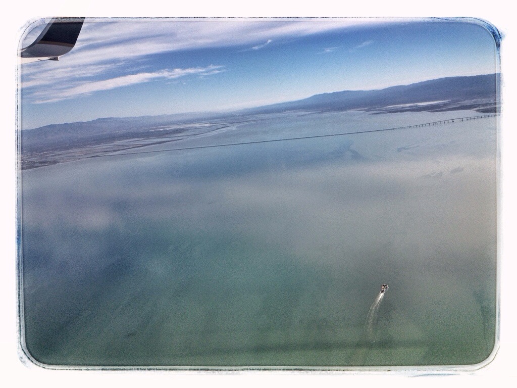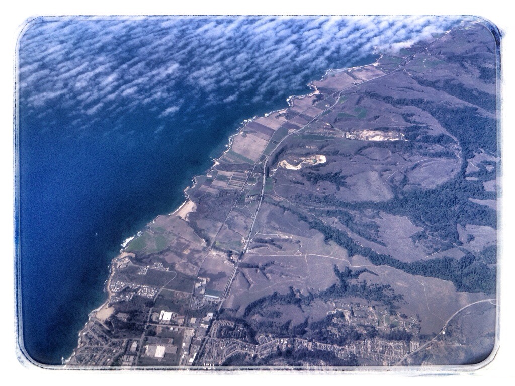 I wish I could have switched sides of the plane at this point, but it was full. We flew out over Monterey Bay, then crossed over land again at Santa Cruz, visible at the bottom of this shot.