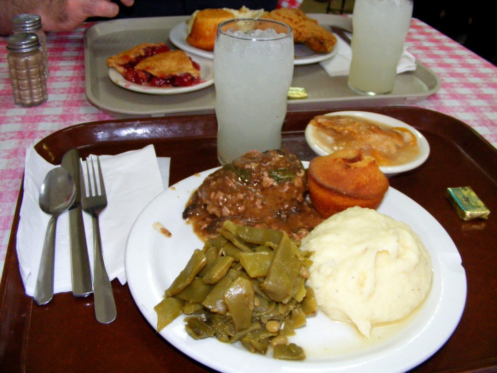 I went with mushroom steak, mashed potatoes, green beans, a cornbread muffin, peach cobbler and lemonade. All of it was amazing, particularly the cornbread.
